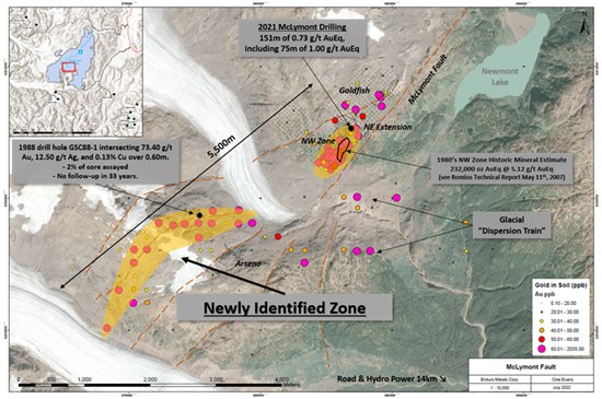 If successful, this would increase the footprint of the McLymont Fault mineralised system to 5,500m, comparable to the very large bulk-tonnage style gold deposits neighbouring the Newmont Lake Property (ex. KSM, Treaty Creek).