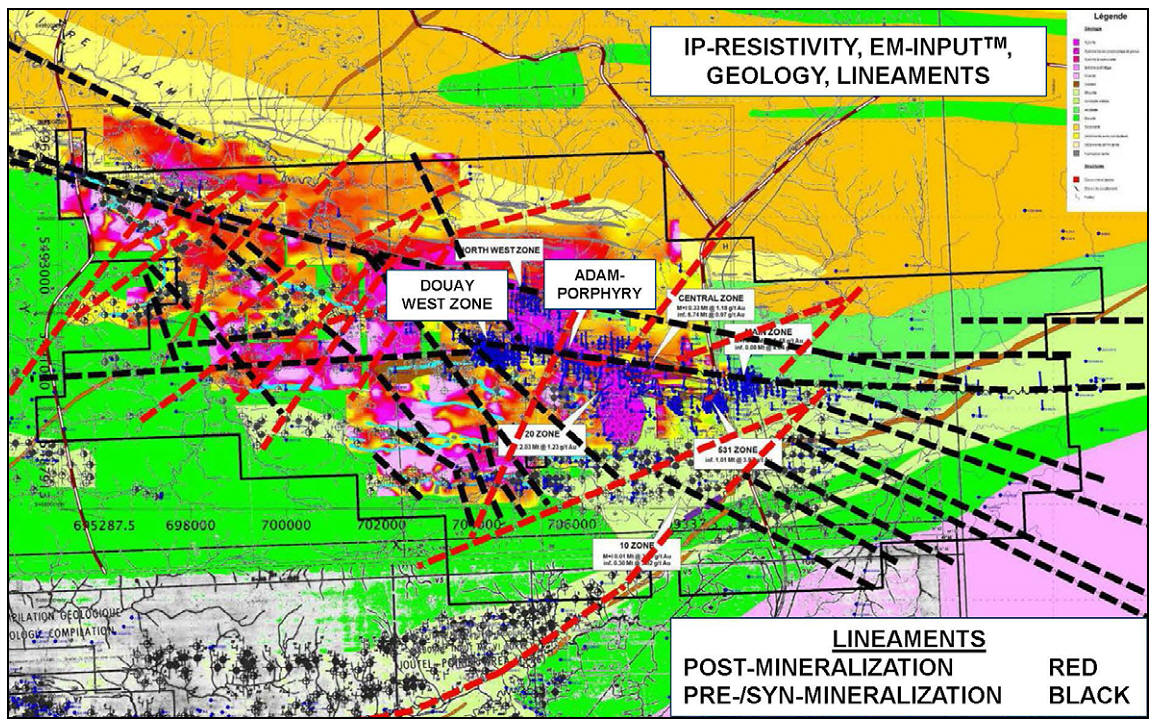 Figure 1 : Carte géologique du projet aurifère Douay illustrant l'emplacement des zones minéralisées. Les zones Douay Ouest et Adam-Porphyre font partie du projet aurifère Douay Ouest, relié par une faille secondaire de la zone de déformation Casa Berardi (traits pointillés noirs).