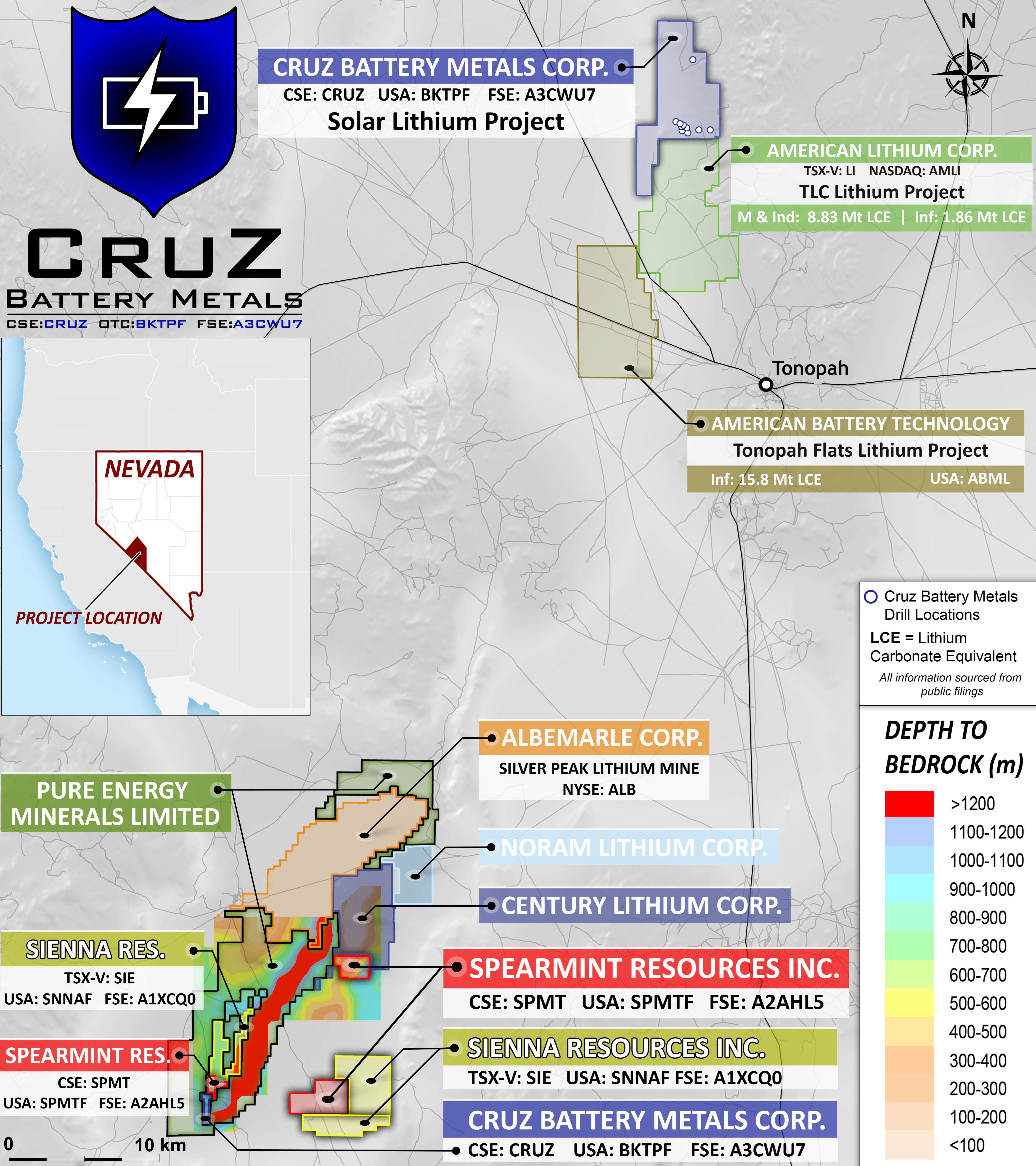 Jim Nelson, President of Cruz Battery Metals stated, "We are encouraged to achieve lithium values higher than 1,160 ppm Li in every hole of the phase-3 drill program. We are immediately formulating a phase-4 drill program. This was our first lithium drill program of 2023, and we anticipate at least 2 additional phases of drilling on the 8,135-acre Solar Lithium Project within this calendar year. The phase 1, 2 & 3 drill programs discovered the presence of lithium in every hole drilled and we've only explored a small fraction of property to date. Cruz is well-funded to complete all planned drilling this year and we anticipate generating our maiden resource estimate in 2023. We are one of the largest landholders in the Big Smoky Valley of Nevada, directly bordering American Lithium who recently announced a substantial increase to their resource estimate. Cruz's goal is to locate and provide a new, domestically sourced, battery grade lithium deposit."