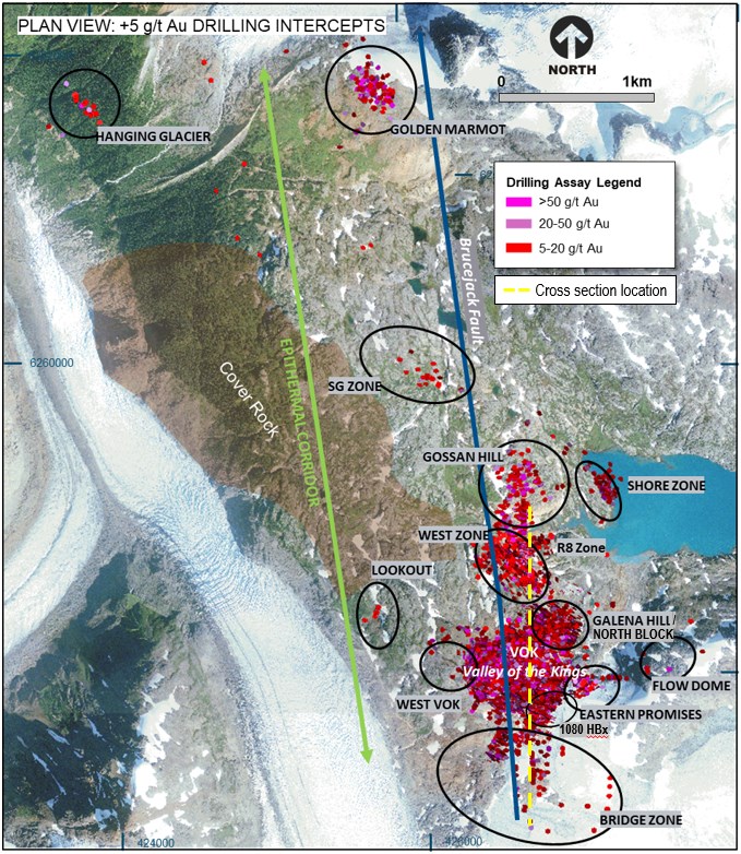 - Gossan Hill to Golden Marmot, multiple targets along the 4km epithermal corridor north of the VOK.