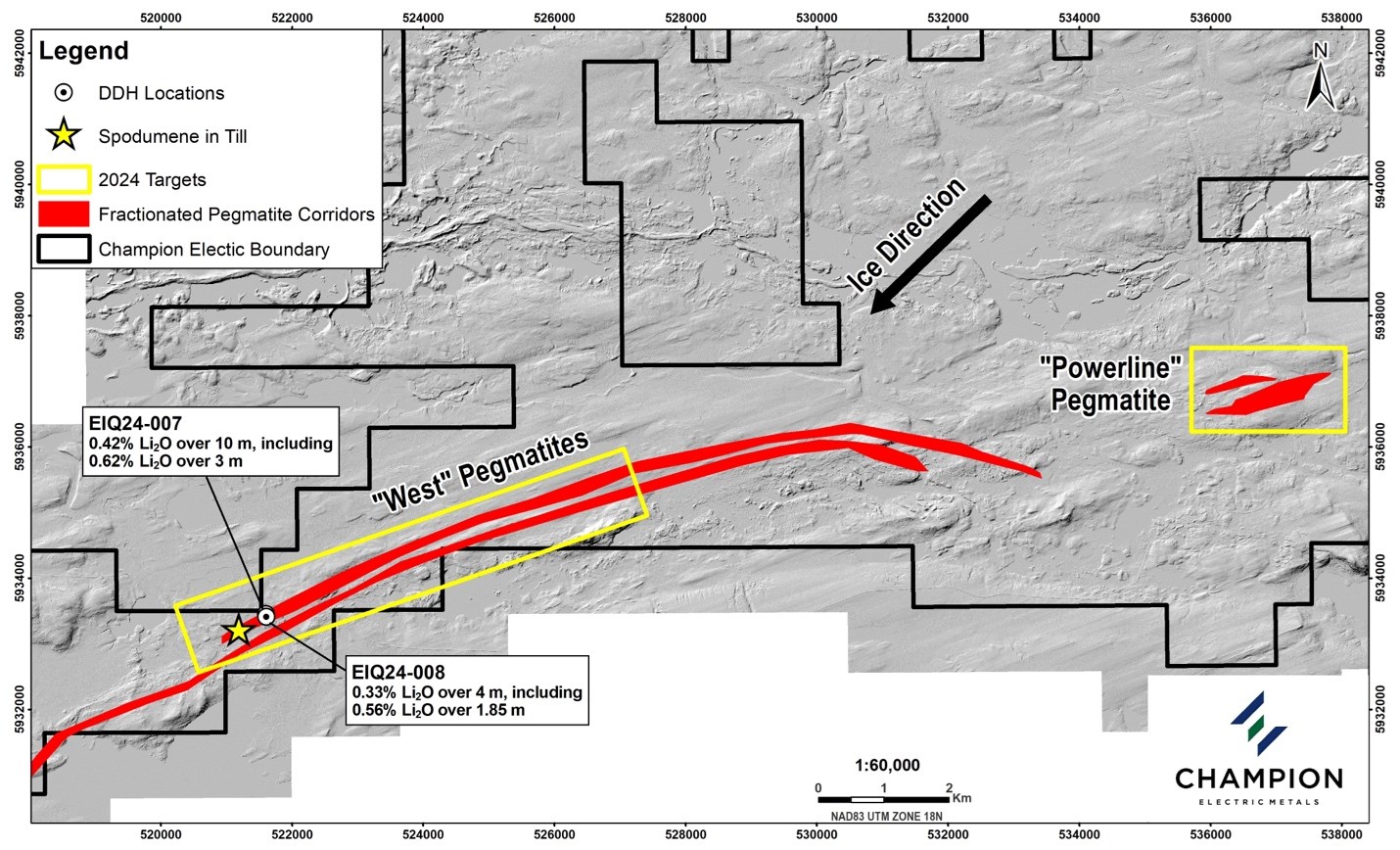 The maiden field program led to the discovery of the first buried lithium pegmatite on the western portion of the property by following up on the discovery of spodumene in till samples. Drill holes EIQ24-007 and EIQ24-008 passed through shallow glacial cover and encountered significant intervals of coarse spodumene crystals and potentially economic lithium mineralization over two to three metres (see Figure 1). Given that pegmatite dykes occur in clusters and that this initial drilling may have just cut the narrow tail of much larger dykes, the Champion Electric technical team has designed a follow-up field program to target the likely continuation of the pegmatite mineral system.