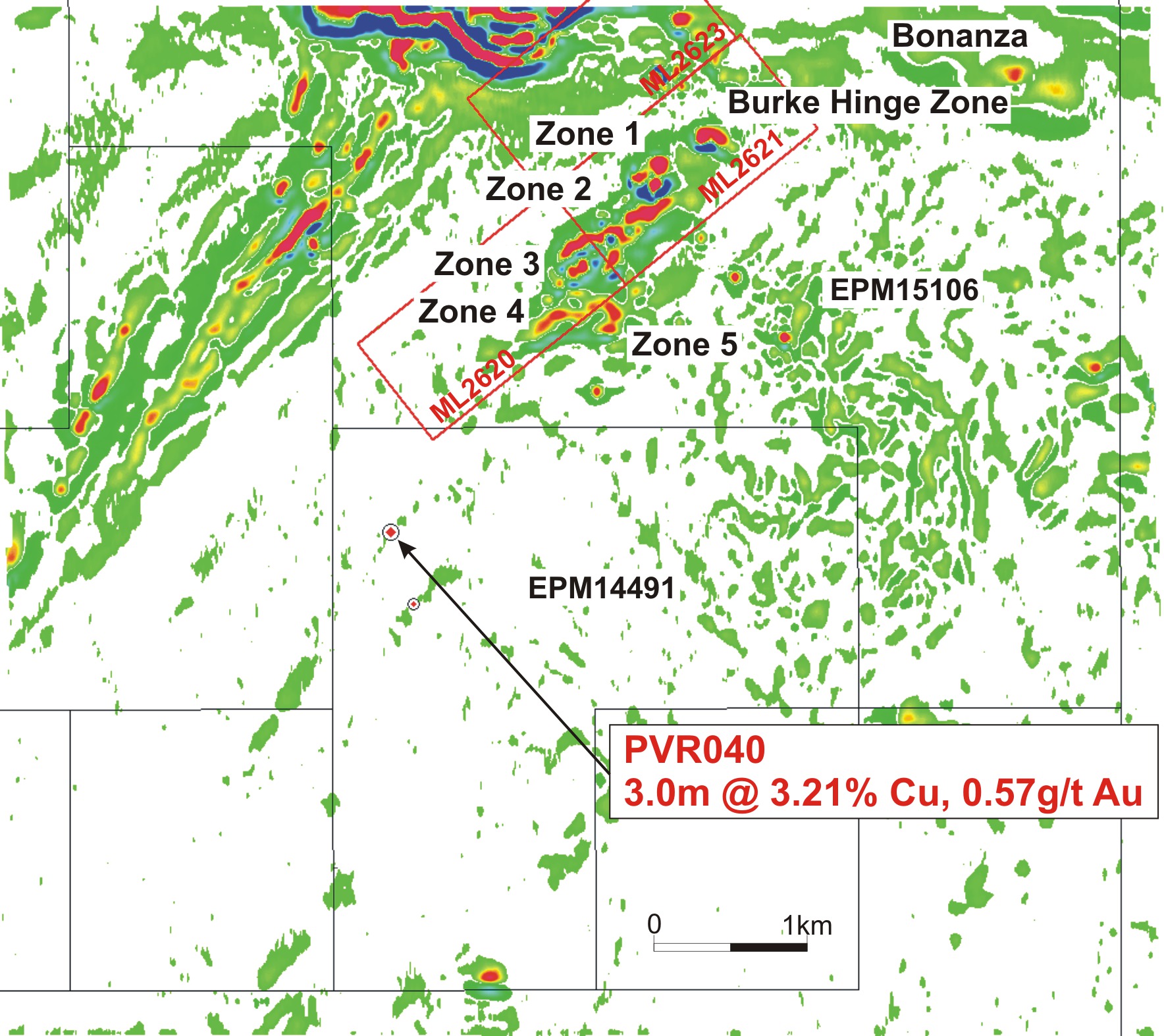 PVR040 is located on the southern exploration permit (EPM14491) of the Pegmont Project, approximately 1.6 km south west of the Zone 5 lead-zinc mineralization at Pegmont. The hole was drilled to test a low level, linear magnetic feature that has a strike length of approximately 500 m.