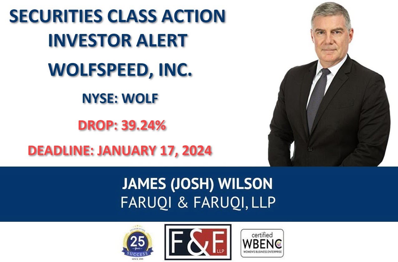To learn more about the Wolfspeed, Inc. class action, go to www.faruqilaw.com/WOLF or call Faruqi & Faruqi partner Josh Wilson directly at 877-247-4292 or 212-983-9330 (Ext. 1310).