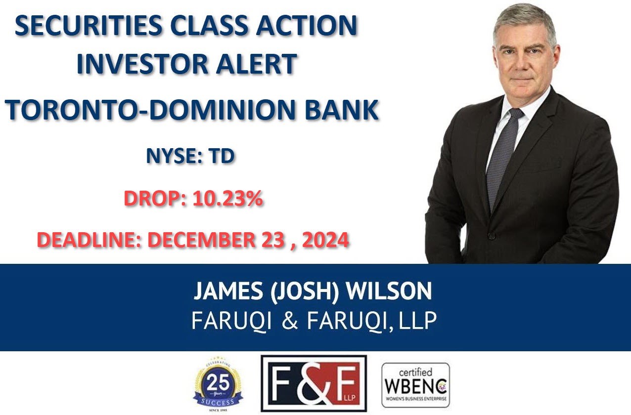 New York, New York--(Newsfile Corp. - December 16, 2024) - Faruqi & Faruqi, LLP, a leading national securities law firm, is investigating potential claims against The Toronto-Dominion Bank ("TD" or the "Company") (NYSE: TD) and reminds investors of the December 21, 2024 deadline to seek the role of lead plaintiff in a federal securities class action that has been filed against the Company.