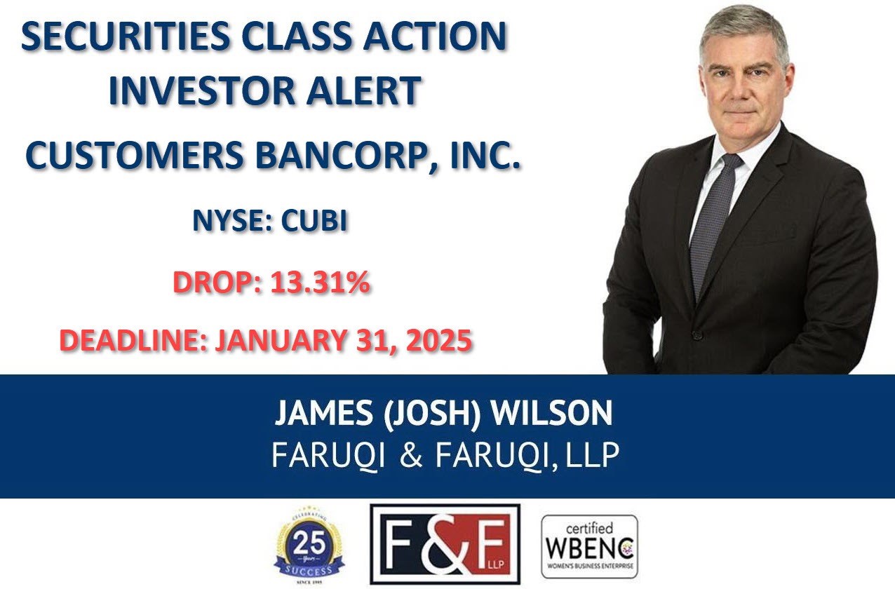 New York, New York--(Newsfile Corp. - December 17, 2024) - Faruqi & Faruqi, LLP, a leading national securities law firm, is investigating potential claims against Customers Bancorp, Inc. ("Customers Bancorp" or the "Company") (NYSE: CUBI) and reminds investors of the January 31, 2025 deadline to seek the role of lead plaintiff in a federal securities class action that has been filed against the Company.