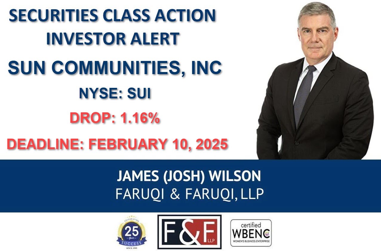 New York, New York--(Newsfile Corp. - December 17, 2024) - Faruqi & Faruqi, LLP, a leading national securities law firm, is investigating potential claims against Sun Communities, Inc. ("Sun Communities" or the "Company") (NYSE: SUI) and reminds investors of the February 10, 2025 deadline to seek the role of lead plaintiff in a federal securities class action that has been filed against the Company.