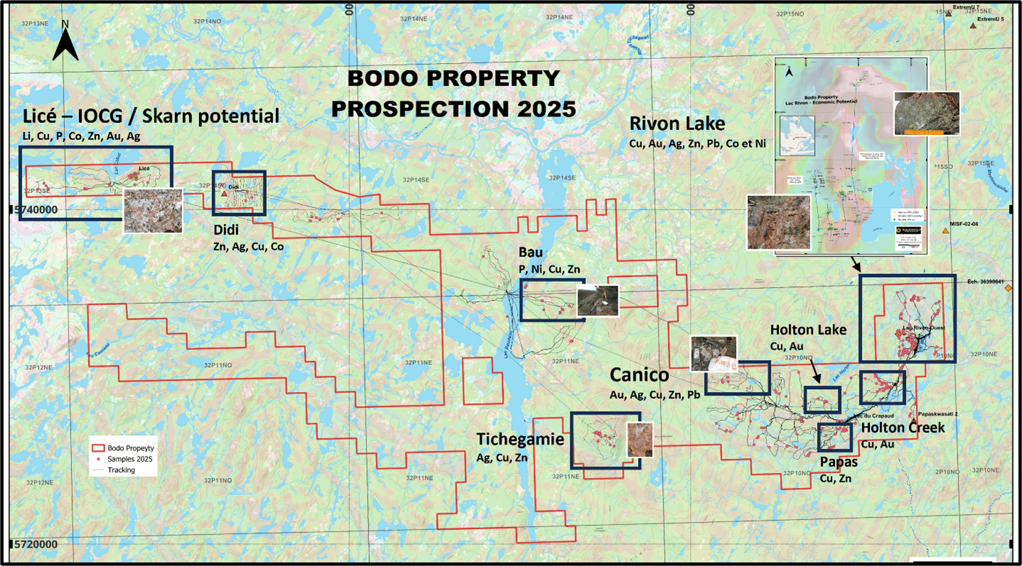Despite encouraging results from other areas, the Company will prioritize its initial efforts at the Rivon Lake polymetallic showing, where historical short drill holes from the 1960s and recent 2024-25 surface sampling identified high-grade copper, silver, zinc, gold, and lead.