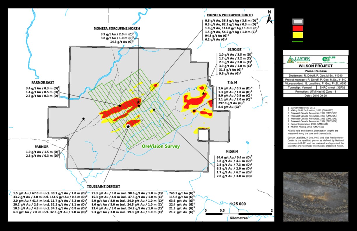 - DDH WL17-15: 6,8 g/t Au über 4,0 m, einschließlich 16,1 g/t Au über 1,0 m (Cartier, 2017)
