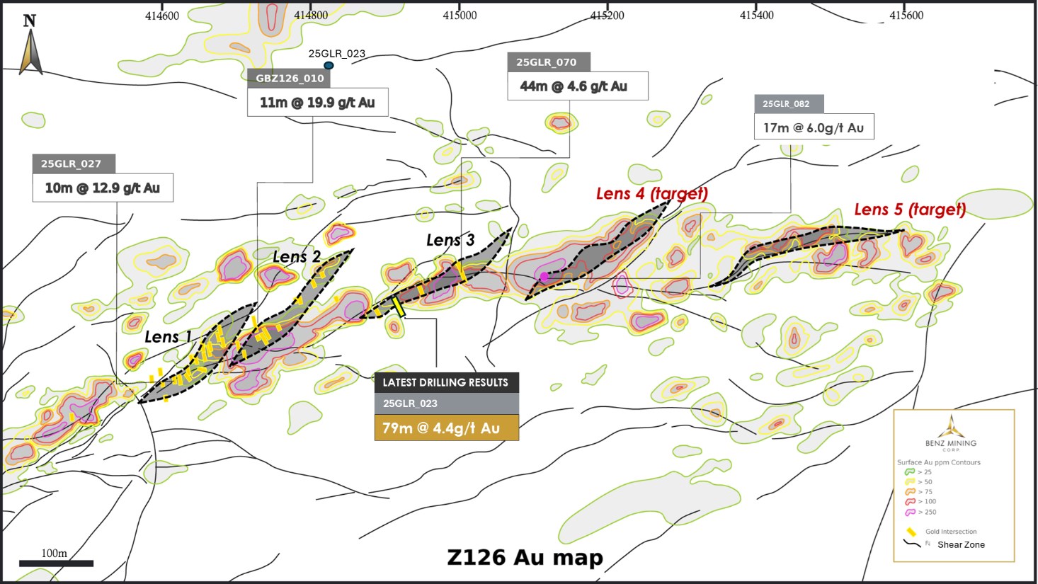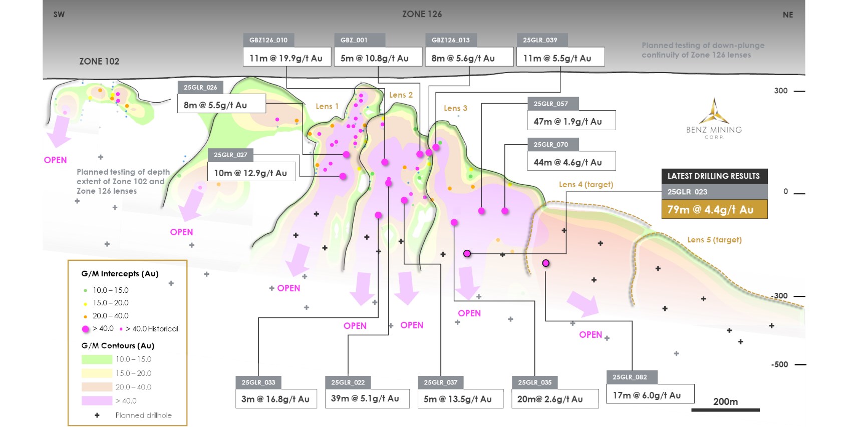 Benz is drilling additional holes into the newly discovered third and fourth lenses (see announcement dated 17 September 2025: 4th High Grade Gold Lens Discovered at Zone 126) whilst also targeting the new fifth lens target with several assays pending. Drilling will continue to define and extend the existing lenses at depth.