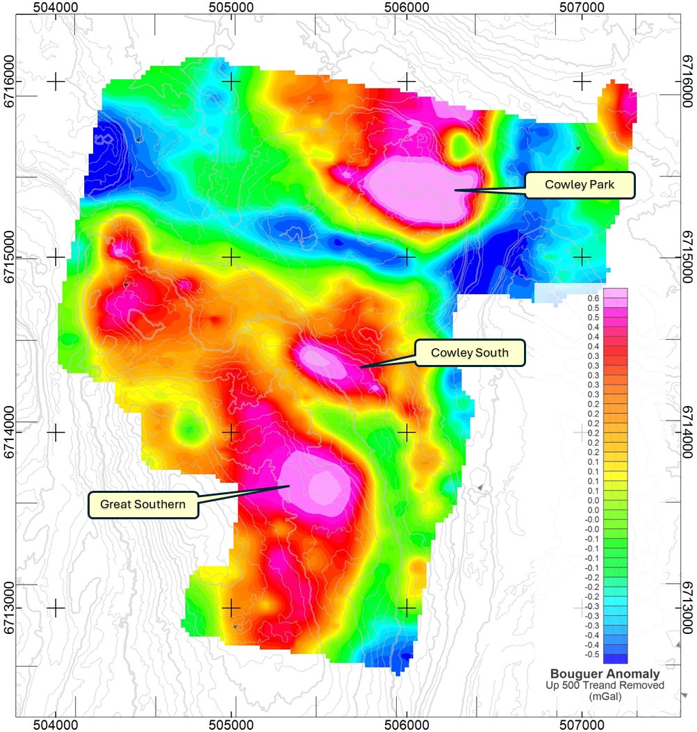 Gladiator recently expanded coverage of its ongoing high-definition gravity surveys over the broader Cowley Park area. This extension of the gravity survey led to the identification of a significant high-density anomaly (named "Great Southern") located approximately 1.5 kilometers south of the main Cowley Park zone and the previously known Cowley Park South target.