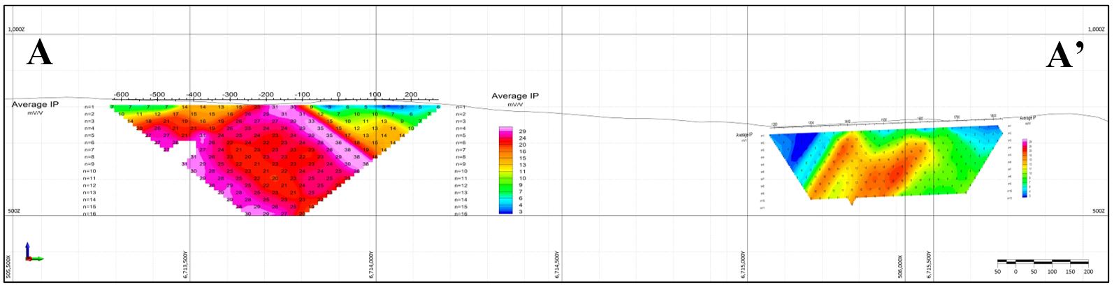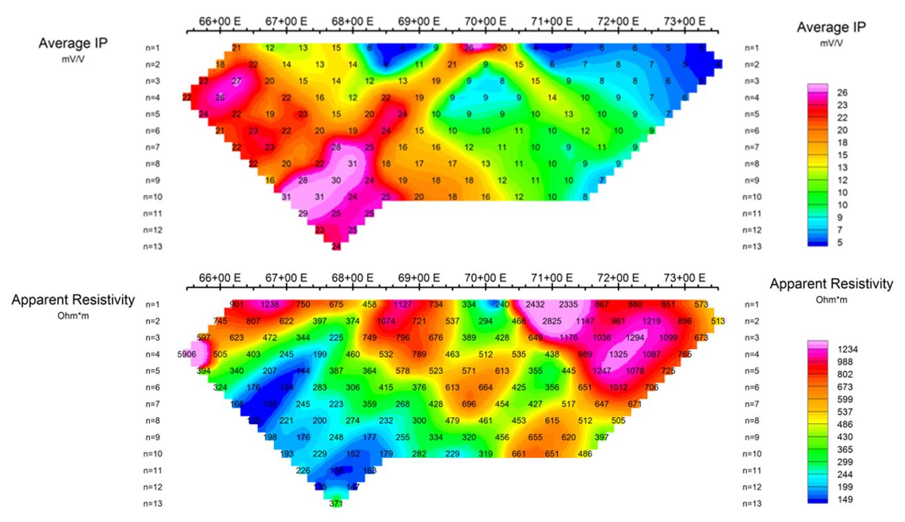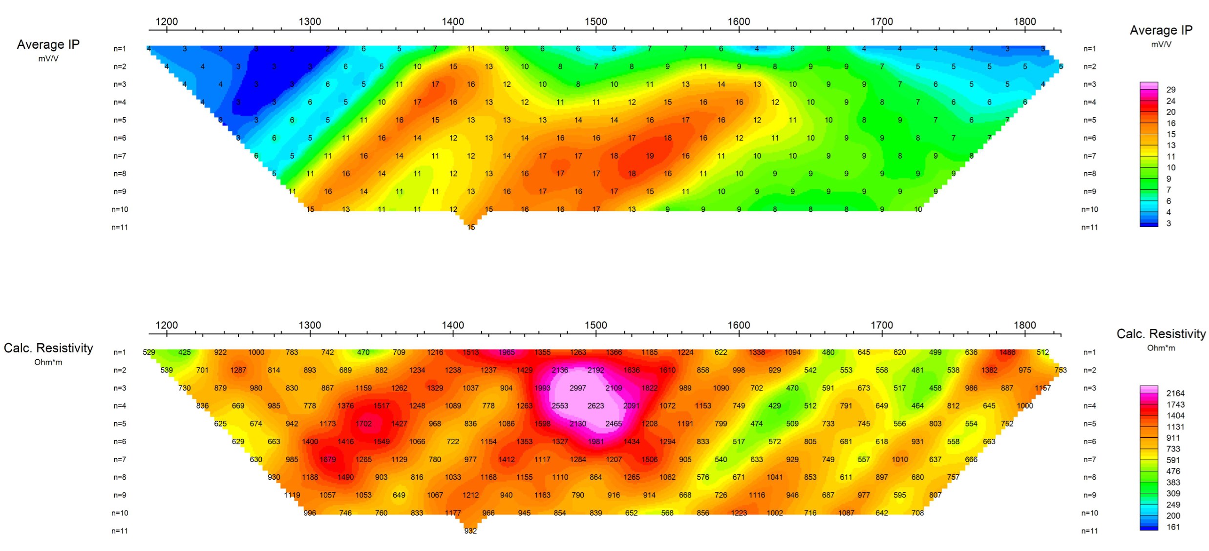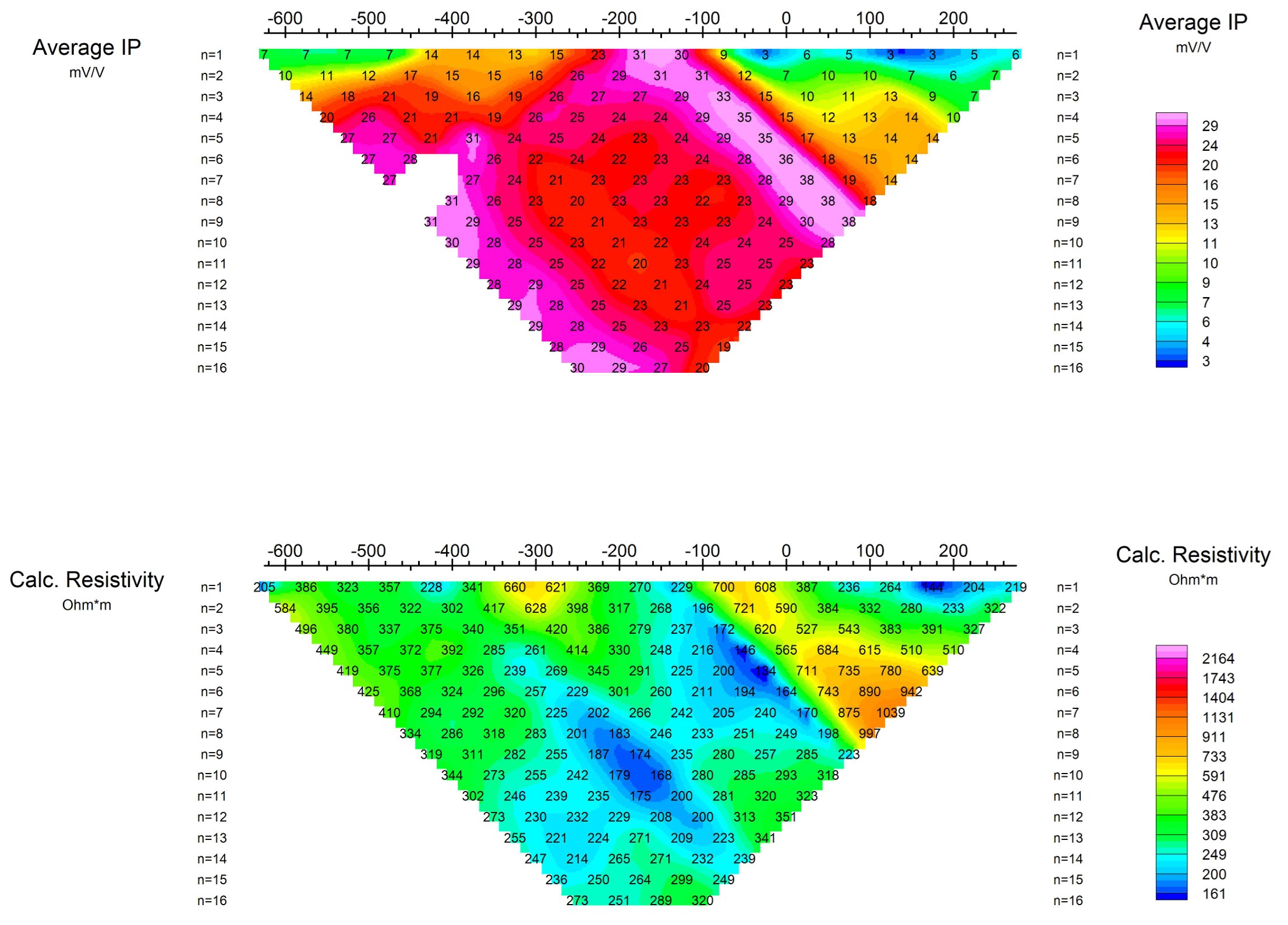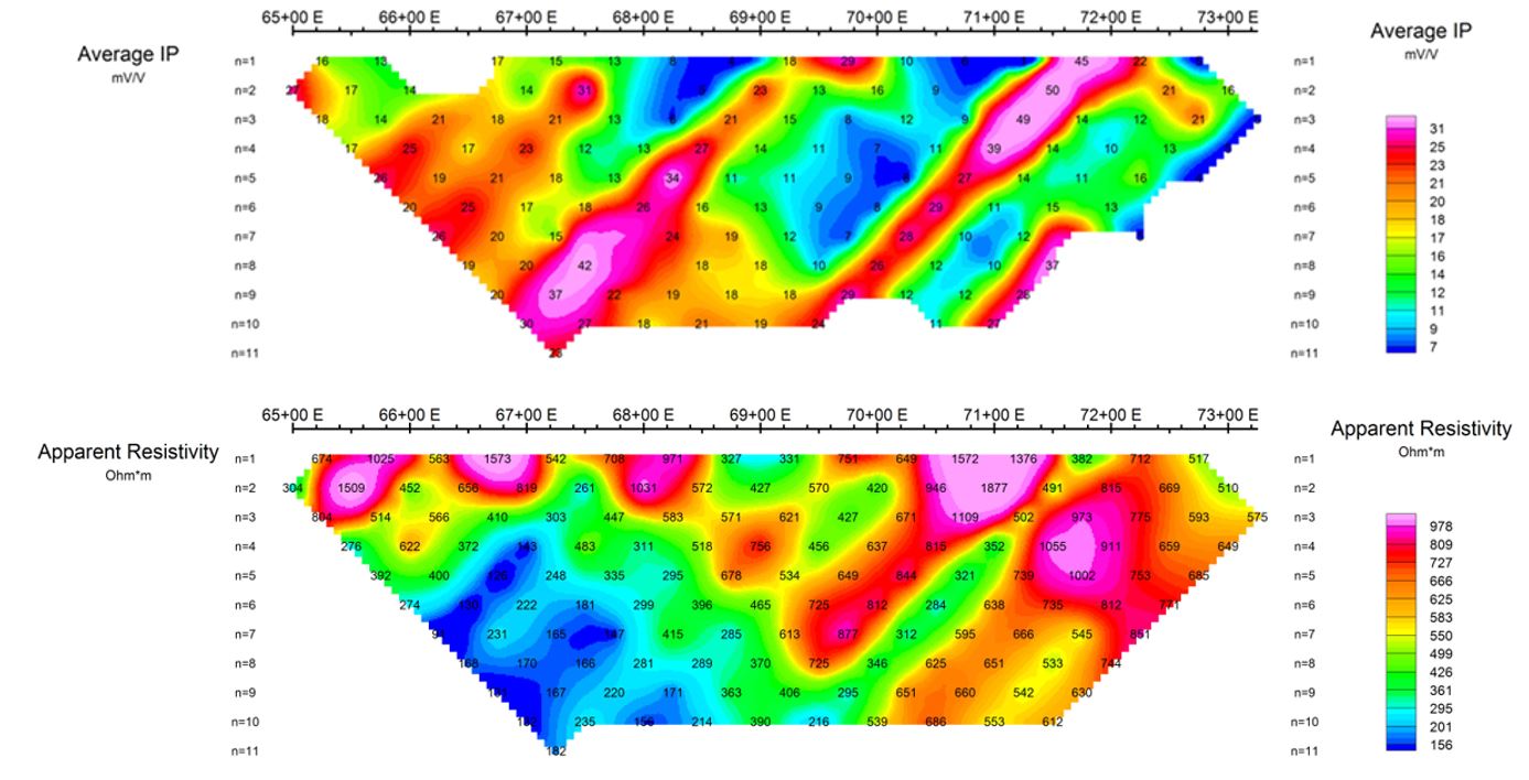 The Induced Polarization (IP) surveys were conducted using an inline modified (proximal) pole-dipole arrays with 50 m dipoles (L10300) and 25 m dipoles (L10580). Minimum current injection to potential dipole separation over the area of interest for L10300 was 500 m and for L10580 was 250 m.