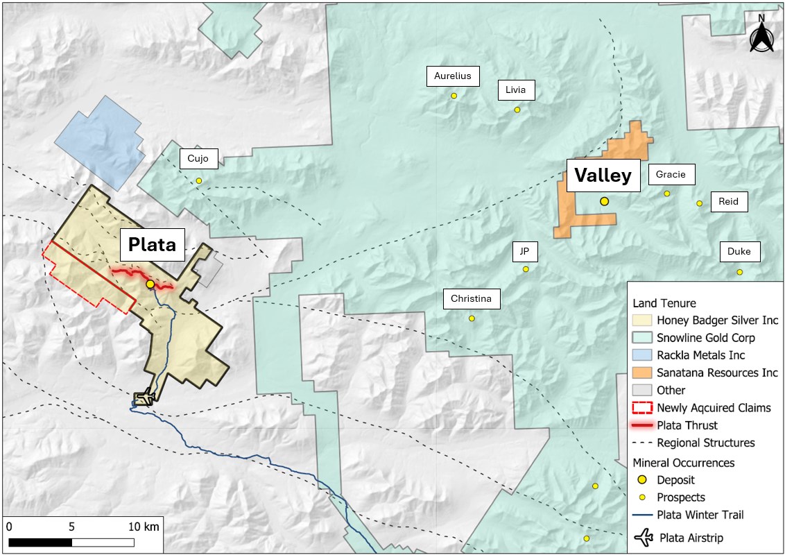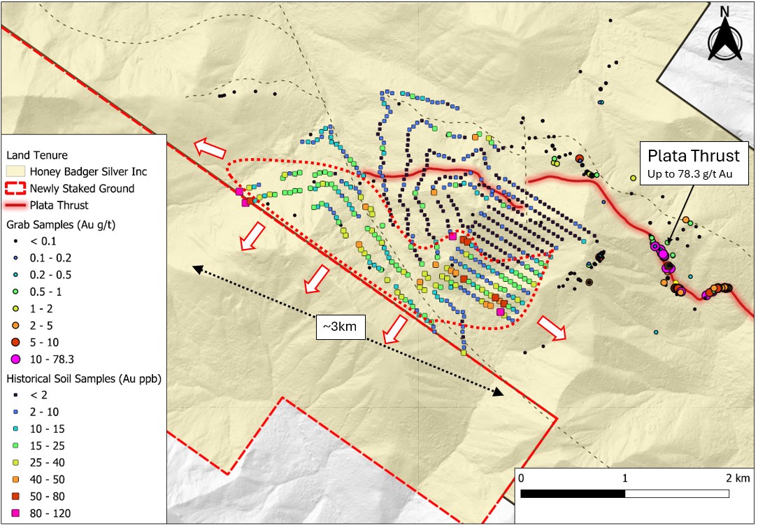 The Company's Executive Chairman, Chad Williams, commented, "Honey Badger continues to identify new and exciting target areas at Plata. This project has exceptional potential. We are particularly encouraged by the continuity of high-grade historical grab samples along the Plata Thrust which returned up to 78.3 g/t Au in outcrop as well as the potential for the Rogue Thrust to be an analog to the Plata Thrust. Additionally, a second zone of gold in soil has been identified and been traced for over 3 km and remains open in three directions. Of note, the Plata property is located adjacent to Snowline Gold's (TSXV: SGD) Rogue property, which contains 7.94M oz Au (M&I) at a grade of 1.21 g/t Au and 0.89M oz Au (Inferred) at a grade of 0.62 g/t Au (see SGD news release dated May 15, 2025)."