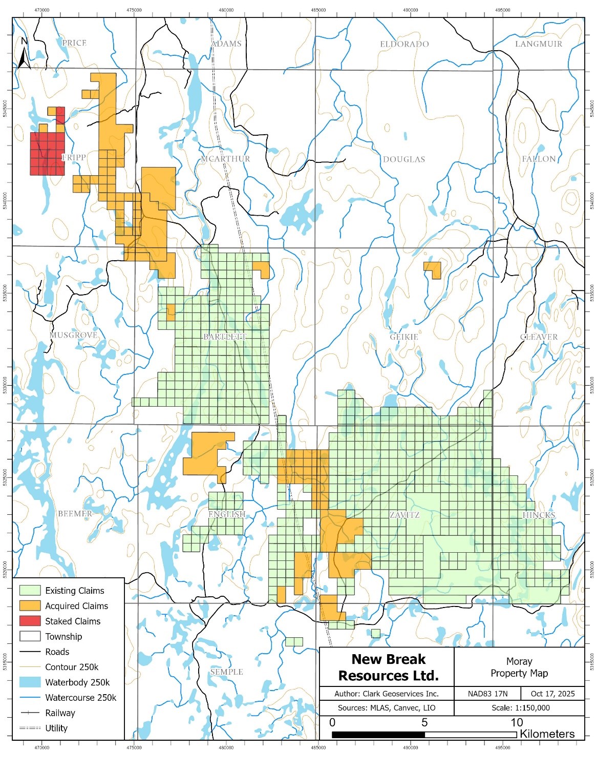 Toronto, Ontario--(Newsfile Corp. - October 17, 2025) - New Break Resources Ltd. (CSE: NBRK) ("New Break" or the "Company") is pleased to announce that the Company has increased its land position to the west and northwest of its main Moray property ("Moray") through the acquisition of approximately 4,719 hectares and staking of approximately 473 hectares of additional mineral claims. Moray is located approximately 49 km southeast of Timmins, Ontario, where the Company's recent maiden drilling program resulted in a new gold discovery. The newly acquired and staked minerals claims are shown as the "Acquired Claims" in orange and "Staked Claims" in red in the figure below and along with the "Existing Claims", represent 22,275 hectares of mineral claims owned by New Break.