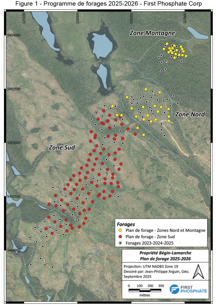 Saguenay, Quebec--(Newsfile Corp. - 21 octobre 2025) - First Phosphate Corp. (« First Phosphate » ou la « Société ») a le plaisir d'annoncer qu'elle entreprendra un programme de forage accéléré de 30 000 mètres sur sa propriété Bégin-Lamarche, située dans la région du Saguenay-Lac-Saint-Jean, au Québec, Canada et qui débutera ce mois-ci.
