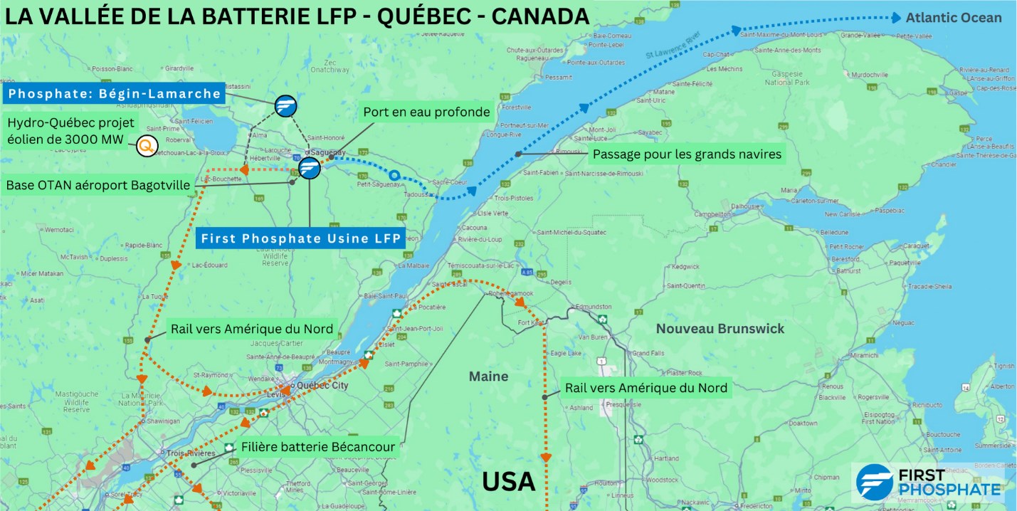 L'usine de traitement secondaire du phosphate proposée par First Phosphate sera située au port de Saguenay, tout près de l'usine prévue de production de matériau actif de cathode LFP (CAM) de la Société à La Baie, au Québec. La propriété de phosphate igné Bégin-Lamarche est située à proximité d'une grande route pavée et à seulement environ 70 km par la route du port en eau profonde de Saguenay et de La Baie, au Québec, permettant ainsi une intégration verticale complète éventuelle des activités d'extraction et de traitement avancé du phosphate igné de haute pureté en CAM LFP, afin de soutenir la relocalisation de l'industrie nord-américaine des batteries LFP.