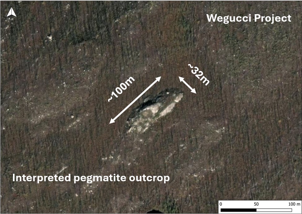 Figure 2: Satellite imagery showing an interpreted pegmatite outcrop up to 32 m wide at the Wegucci project.