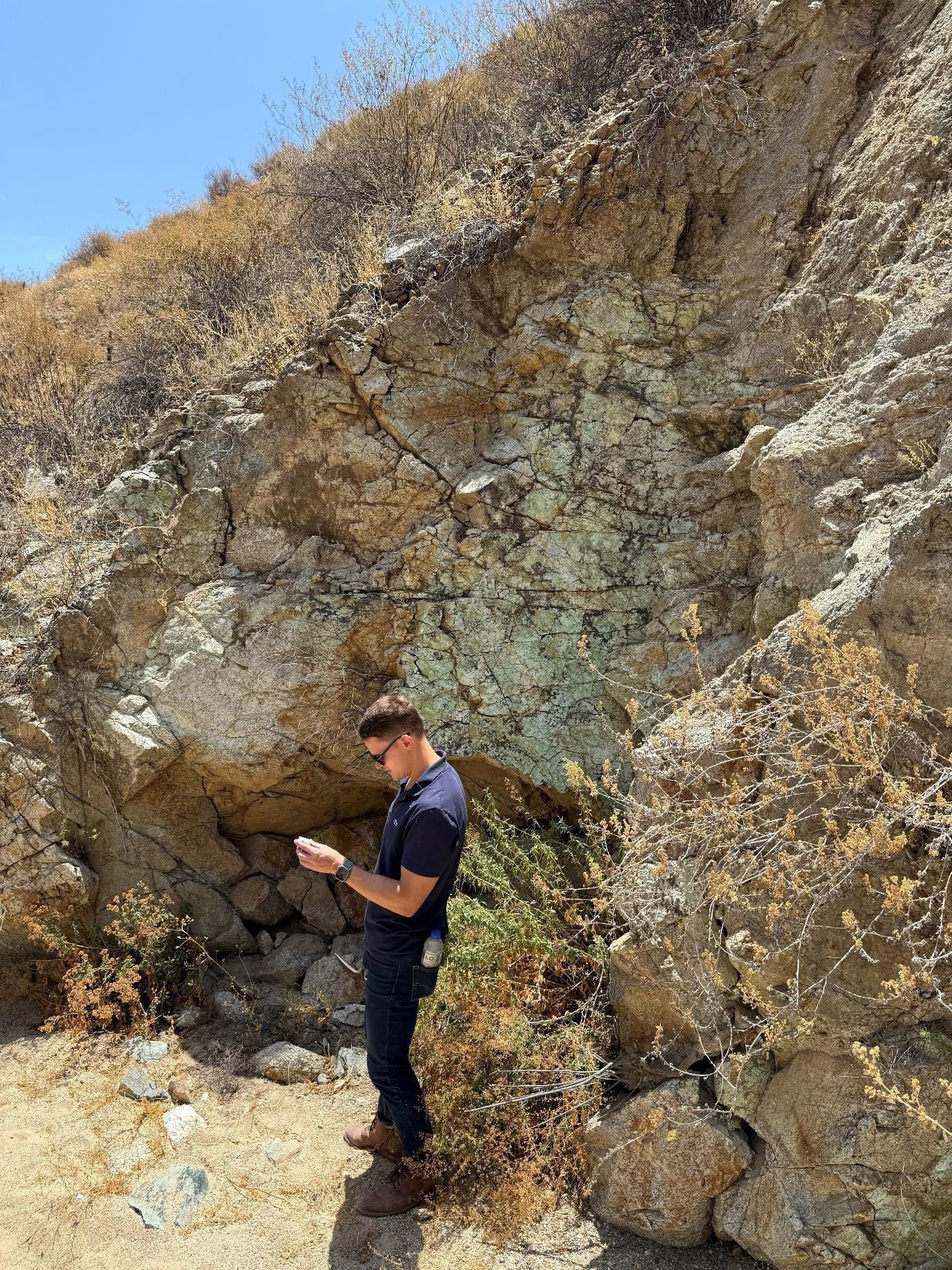 Figure 4: CEO Mitch Thomas during a due diligence site visit in October 2025 with Solis Minerals' exploration team. The area exhibits oxidised mineralisation localised along joints in granodiorite of the Central Zone of Cucho (Figures 7, 8). Photo is at a site between drill collars COP14-01 and COP14-02 (Figure 8); assay results included within this announcement. Host rocks include diorites, metasomatized granodiorites within the Coastal Batholith of Peru cut by multiple sets of quartz veining.