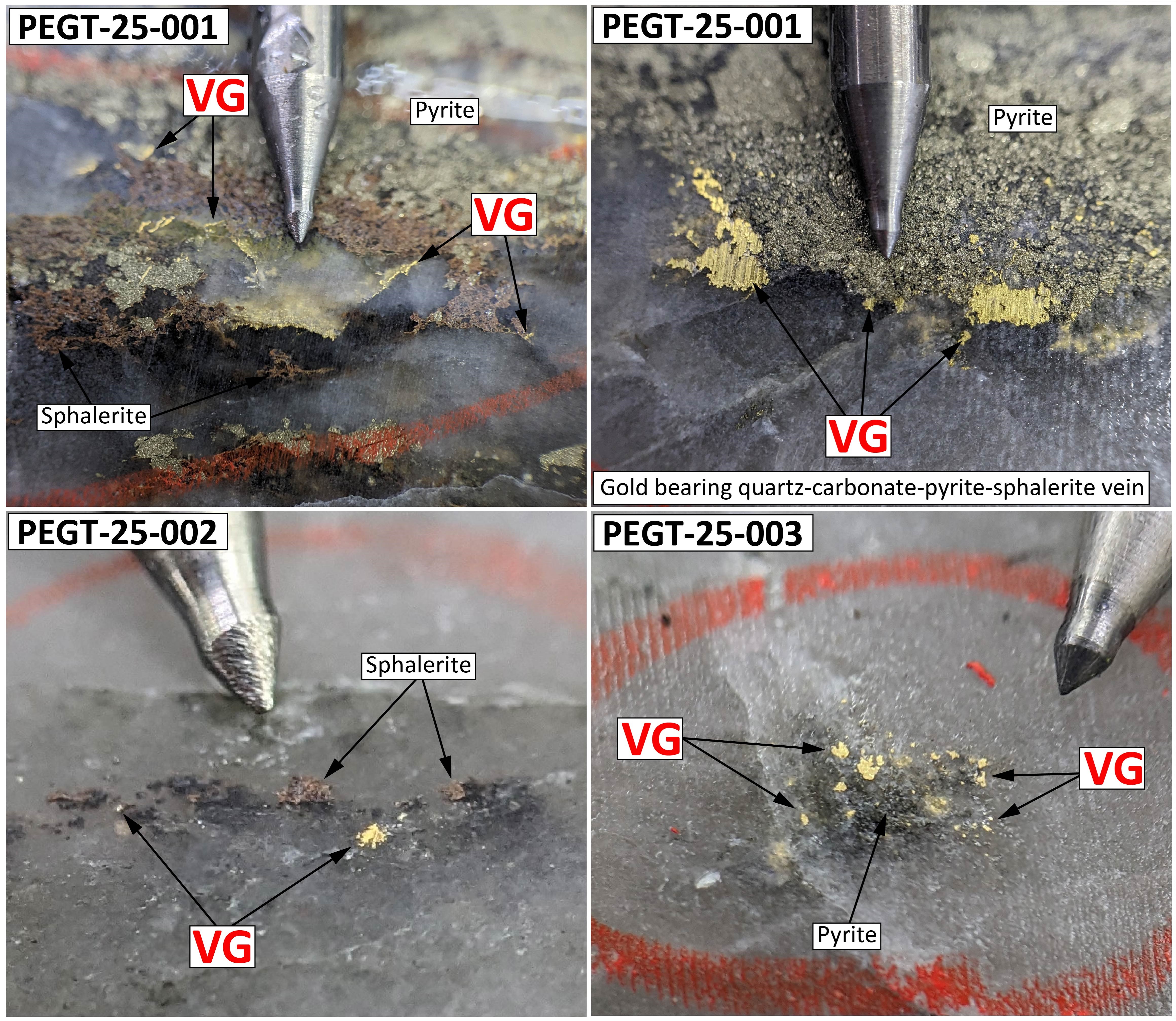 Figure 3: Photos of visible gold in the Champagne Zone from drill holes PEGT-25-001, 002 and 003. Mineralization is represented by gold bearing quartz-carbonate-sulfide veins with visible gold hosted in the aphanitic Beaupré rhyolite. Abbreviation: VG - Visible Gold.
