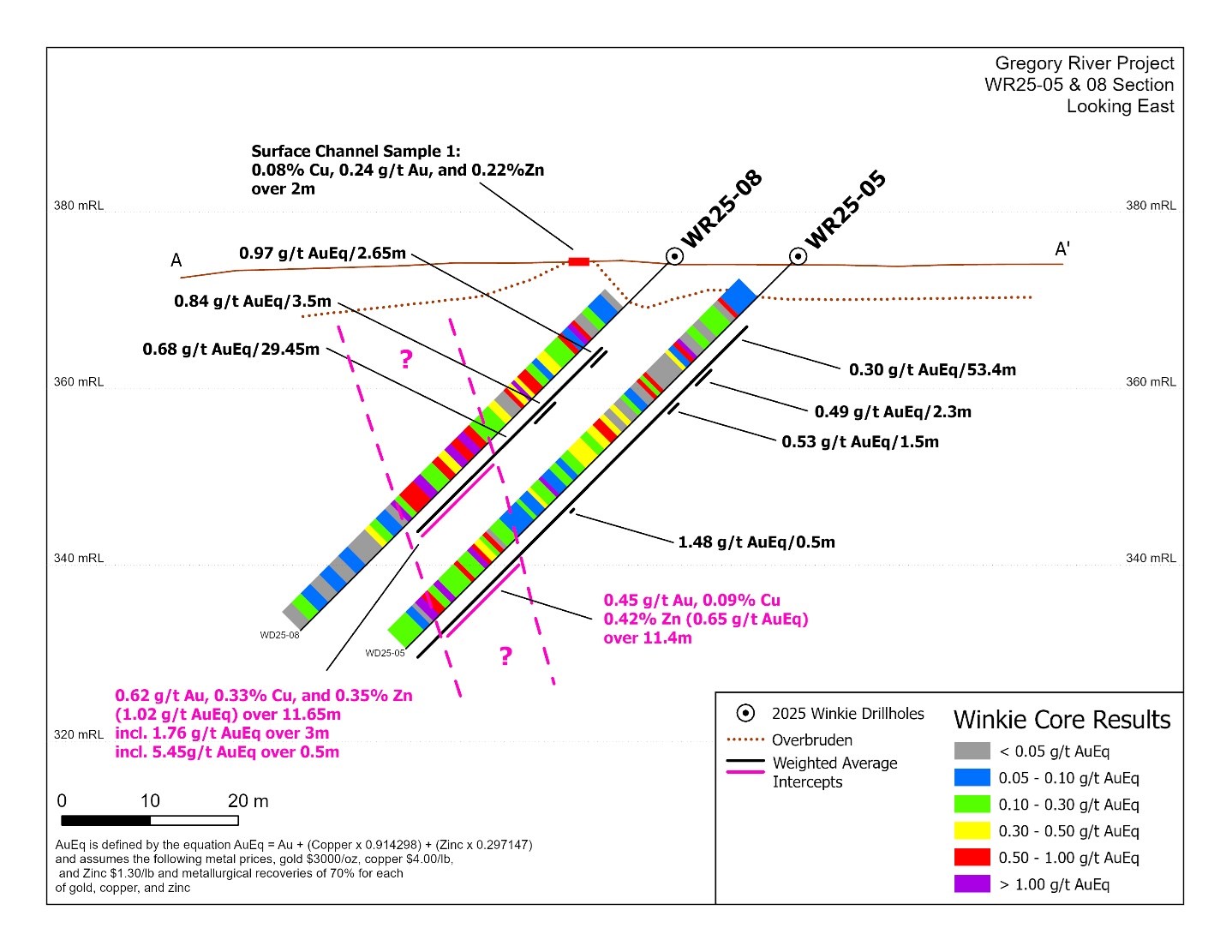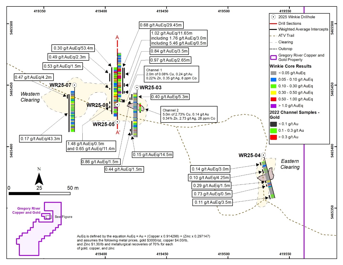 - 0.30 g/t AuEq over 53.4 m (hole WD25-05, 9.5 m to 62.9 m)