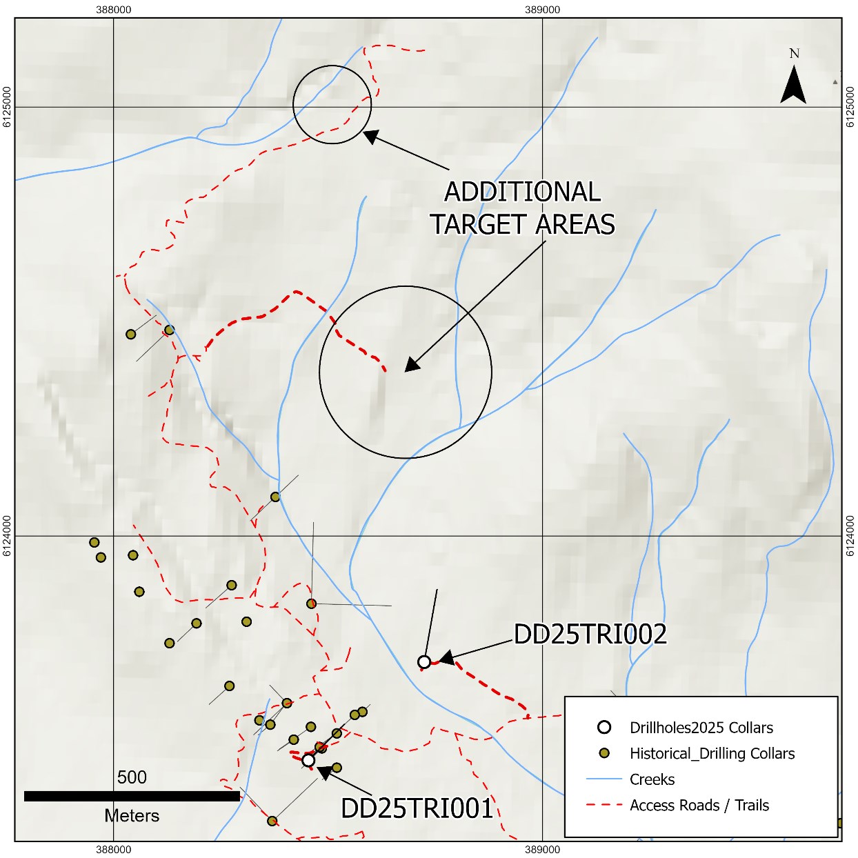 Figure 1 - Map showing Pacific Empire's Trident property, highlighting historical drill collars, the first two 2025 diamond drill holes (DD25TRI001 and DD25TRI002), and additional untested target areas to the north.