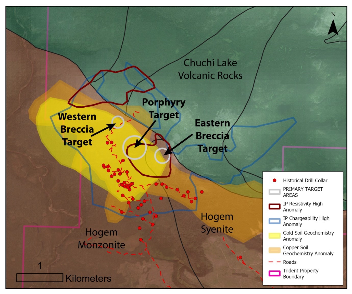 Figure 2 - Compilation map of the Trident property showing multiple independent datasets converging on a major discovery opportunity. A large porphyry target is outlined by copper and gold soil anomalies, resistivity and chargeability features, and favorable intrusive-volcanic contacts. Flanking this centre, conductivity highs define undrilled breccia targets supported by strong copper geochemistry. Together, the data outline a system-scale copper-gold target that has never been tested.