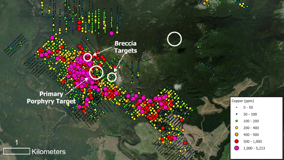Figure 3 - A highly anomalous copper-in-soil anomaly defines the primary porphyry target at Trident. On a moderate slope, the source of the anomaly is most likely located near its upper extent - precisely where drilling is planned. This anomaly, combined with supporting geophysics and geology, makes Trident one of the most exciting undrilled porphyry copper-gold targets in British Columbia.