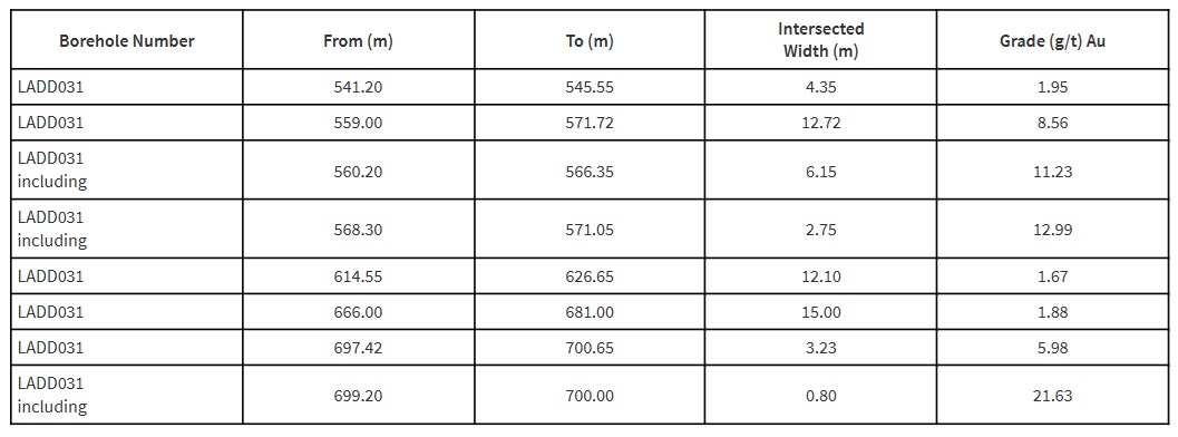 - Results from hole LADD031 reported 12.72 metres grading 8.56 g/t gold, 12.10 metres grading 1.67 g/t gold, 15.00 metres grading 1.88 g/t gold and 3.23 metres grading 5.98 g/t gold