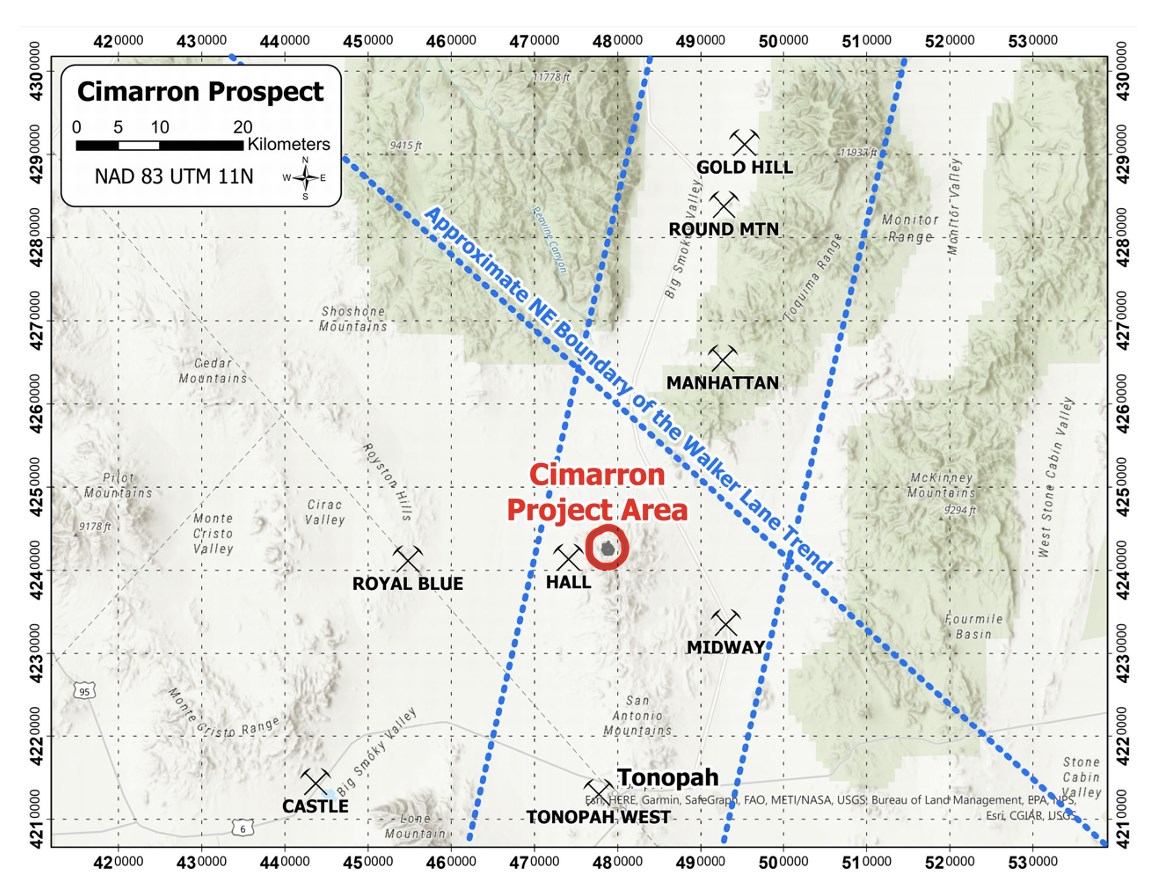 The Cimarron high-grade epithermal gold target is associated with the historic San Antonio mine located in Nye County, Nevada approximately 30 kilometers North of the mining town Tonopah, Nevada.