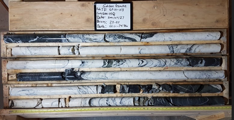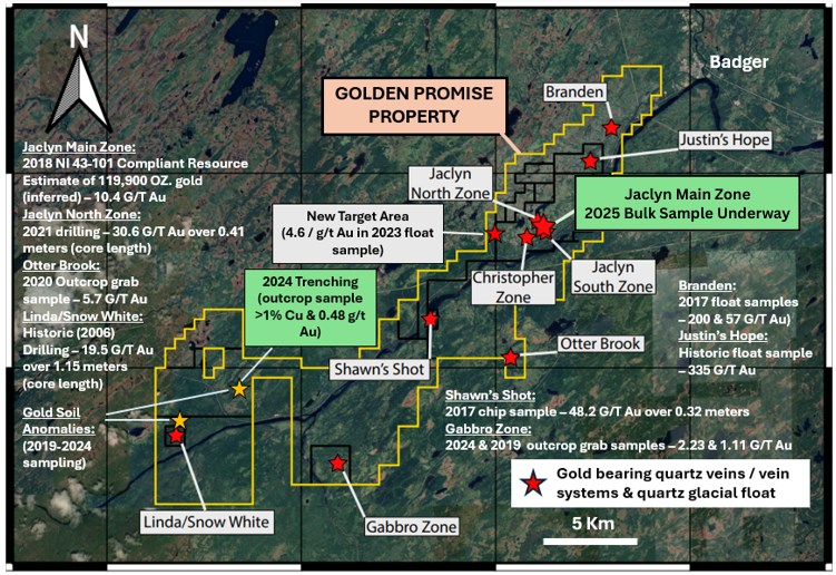 The Golden Promise Property hosts gold bearing quartz veins in various regions of the property including the Jaclyn Zone quartz vein systems, Shawn's Shot quartz vein, Otter Brook occurrence, Linda / Snow White quartz vein system and the Gabbro Zone occurrence. The Jaclyn Main Zone is the most advanced of the gold bearing vein systems