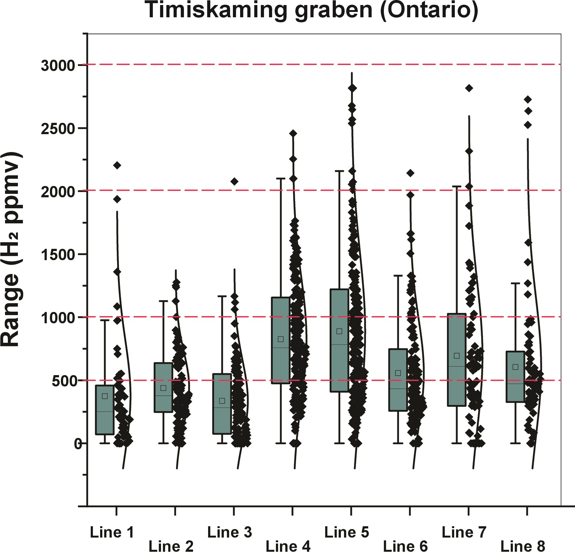 The statistical distribution of the data measured along Lines 5 to 8 was compared with that of Lines 1 to 4 (Fig. 1). The presence of strong hydrogen concentrations was confirmed on Line 5. Overall, hydrogen (H₂) concentrations are generally higher along Lines 6 to 8 than in the southern portion of the survey area (Lines 1 and 2). This demonstrates a clear north–south variability in the natural hydrogen potential within the Ontario segment of the Témiscamingue Graben system. The distance separating Lines 4 and 5 is 1.6 km, and the survey area covering Lines 1 to 8 extends over 11.3 km along the north–south axis and 23 km east–west—representing an area of approximately 260 km².