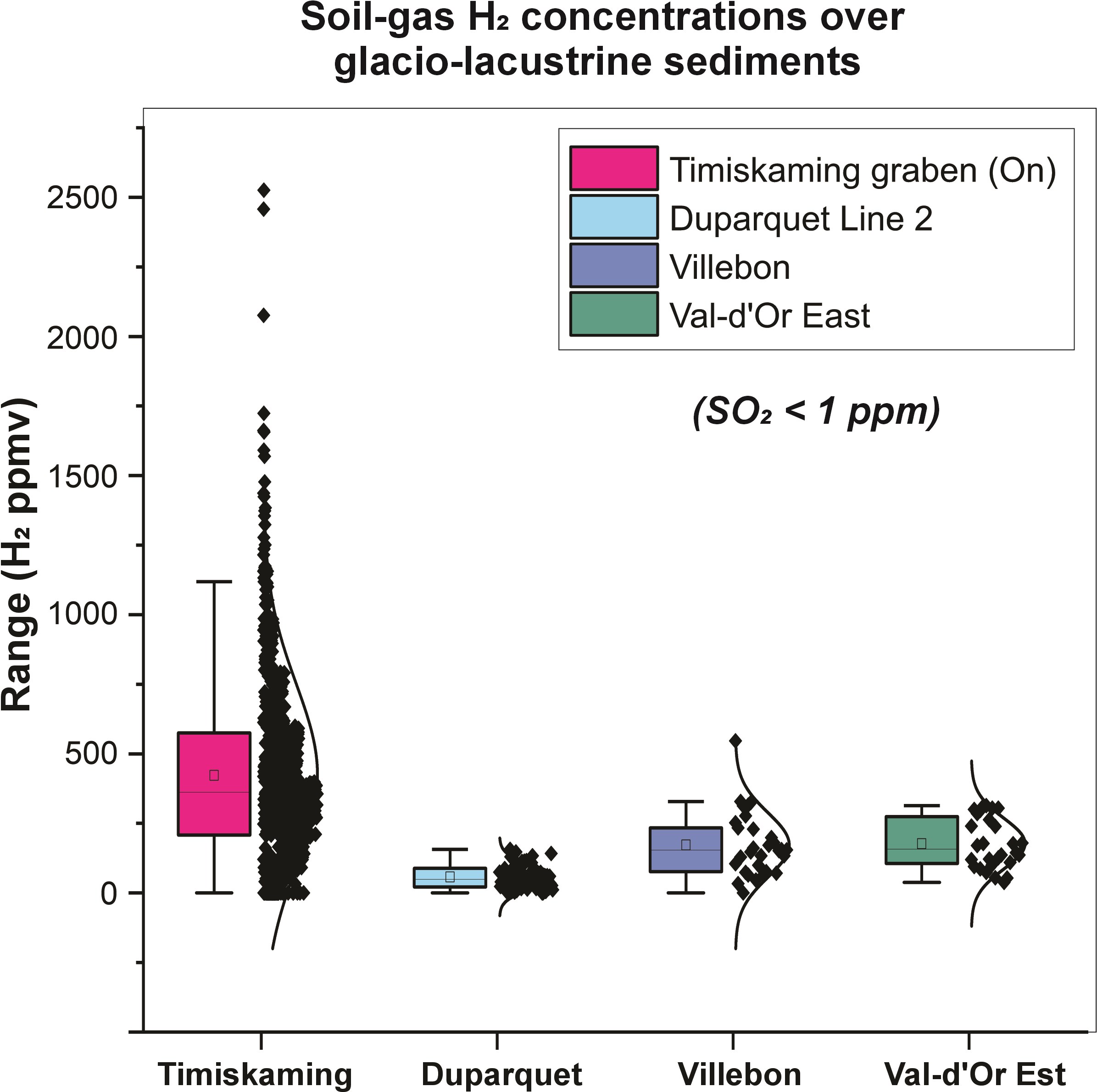 Figure 2. Statistical compilation of Soil-Gas hydrogen data measured in the Ontario section of the Témiscamingue Graben and along profiles conducted in the Duparquet, Villebon, and East Val-d'Or regions. The data shown in this diagram are filtered to include only samples containing less than 1 ppm of SO₂.