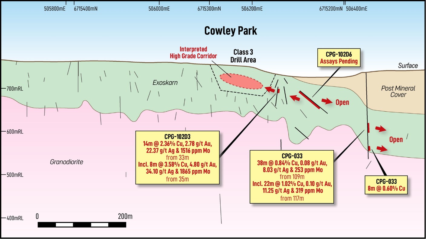 "Ongoing resource definition drilling on the defined mineralized skarn at Cowley Park continues to deliver consistent high copper grades from near surface and confirms the exciting potential of the Cowley Park prospect. Particularly encouraging is the developing continuity of the Southern Limb in ongoing drilling which is contributing significant high-grade copper skarn mineralization to the resource model.