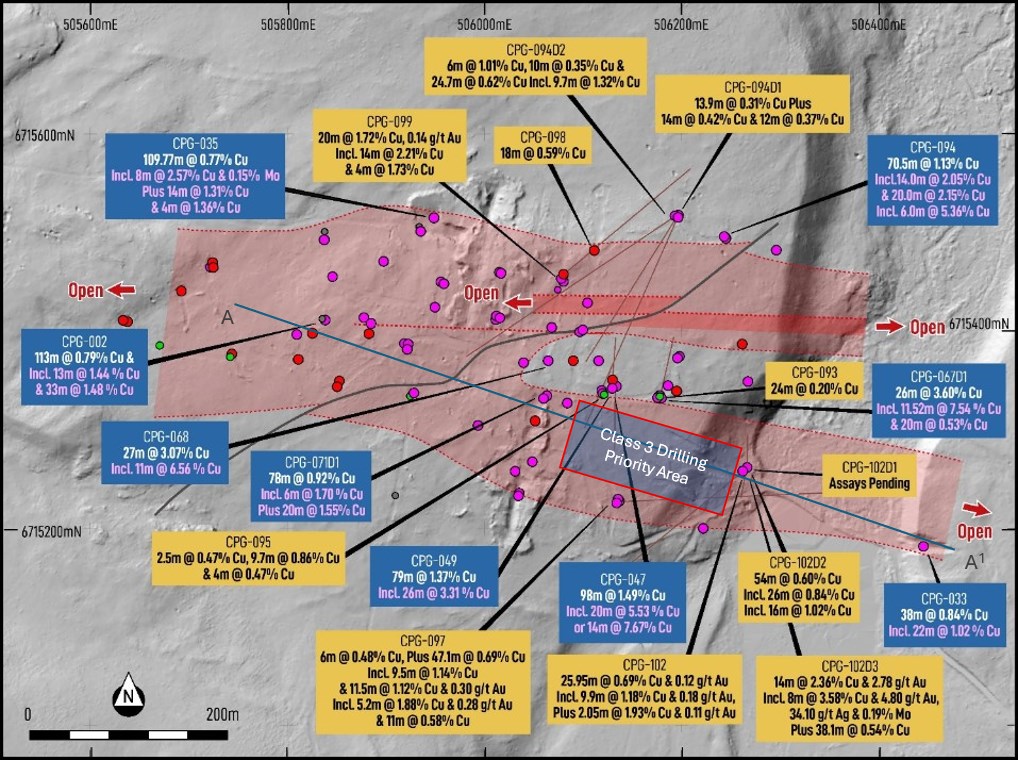 CPG-102D3 returned 14.0m @ 2.36% Cu from 33.0m plus 2.78 g/t Au, 22.37 g/t Ag & 1,516 ppm Mo including: