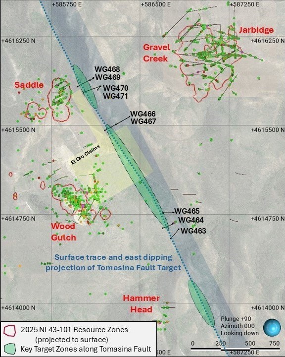 The Tomasina target is a 2.5 km long structural zone down dip of the Saddle and Wood Gulch NI 43-101 resources and the Hammer Head mineralization. It is projected to intersect the highly favorable Eocene Frost Creek tuff (main host rock at Gravel Creek) at the faulted unconformity with the basement Permian-Mississippian Schoonover Formation.
