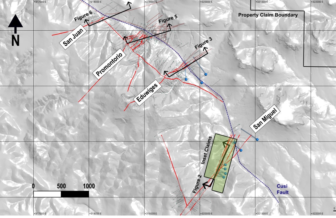 With the acquisition of the Cusi Property, the Company additionally acquired and consolidated two inset claims along the San Miguel vein system. This area has a small open pit mine at surface (~30 m depth) and minor underground workings from historical mining, assumed to be pre-2000s.