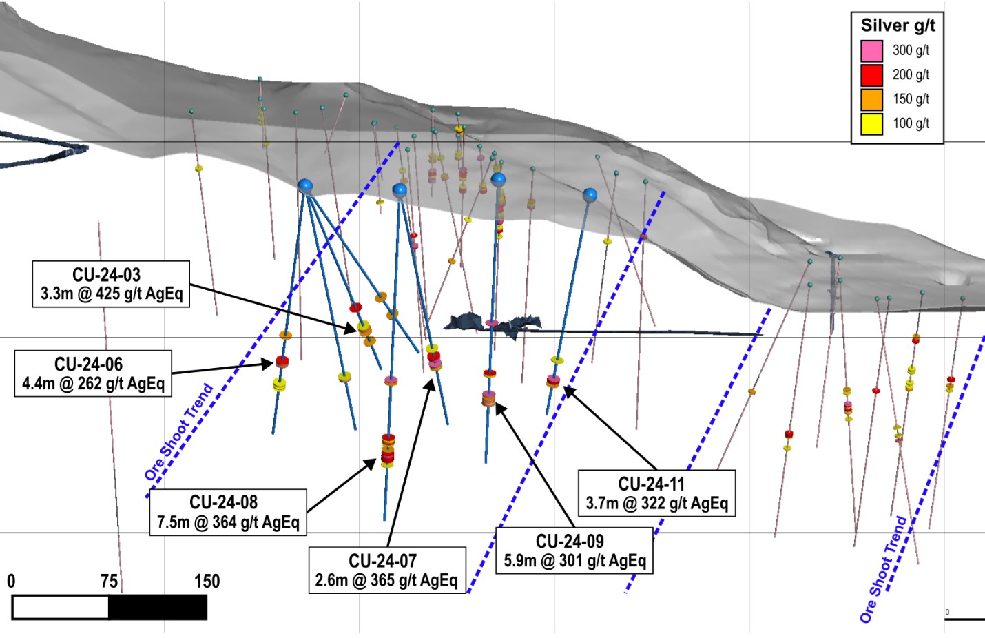 The San Miguel vein system was hit in the majority of the drill holes, with the best intercept in CU-24-08 with 7.5 metres of 364 g/t AgEq. Hole CU-24-08 was the deepest intercept of the program highlighting that the vein system is currently open at depth and increasing in width. Other intercepts of note are highlighted in Figure 2 and Table 1. The system remains completely open at depth and along strike. Another ore shoot directly to the east of this drilling remains open as well, with only historical, near surface drilling.