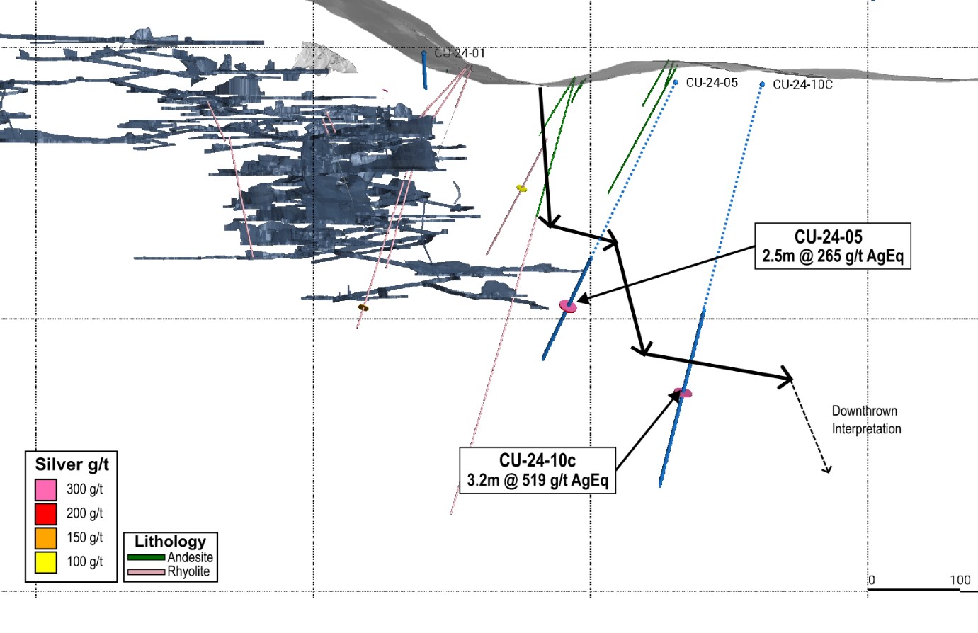 Hole CU-24-10C successfully intersected the Eduwiges vein structure to the east of the Cusi fault, returning 3.2 metres of 519 g/t AgEq. This intercept is a 200 metre step out from historical workings at Eduwiges 190 m from hole CU-24-05 intercept of 2.5 metres of 265 g/t AgEq. Historical drilling in the area was unable to successfully target the vein. This intercept confirms the Company's structural model and provides a new, deeper exploration horizon that is predicted to host the same high-grade potential as its shallow, un-faulted counterpart, on all the vein systems on the Cusi property.