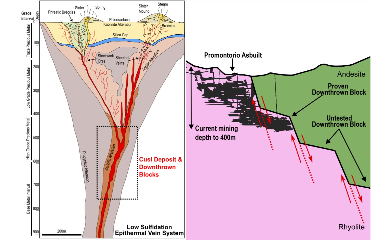 The Company's exploration target is based on a structural model which suggests a significant post-mineral fault has displaced all the vein systems on the property to the east of the Cusi fault. This means the downthrown block, while occurring at a deeper elevation relative to surface, represents the same favorable relative elevation within the overall epithermal mineral system. This structural understanding indicates the continued potential for the same high-grade silver mineralization found in the un-faulted portions of the deposit. A conceptual exploration model is provided in Figure 4, with the Promontorio underground workings reference for scale.