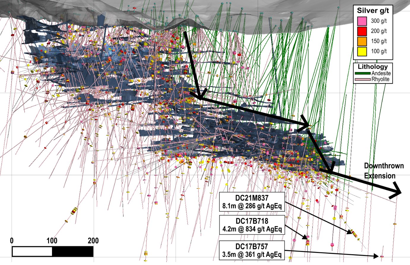 Historical drilling, conducted in 2006 and 2007, targeted approximately 30 m below the open pit and returned excellent results, including hole DC07B077 which hit 482 g/t Ag over 7.5 m and DC06B030 which returned 390 g/t Ag over 7.0 m. No drilling was completed after 2007 as the ownership of the claims was subsequently disputed.