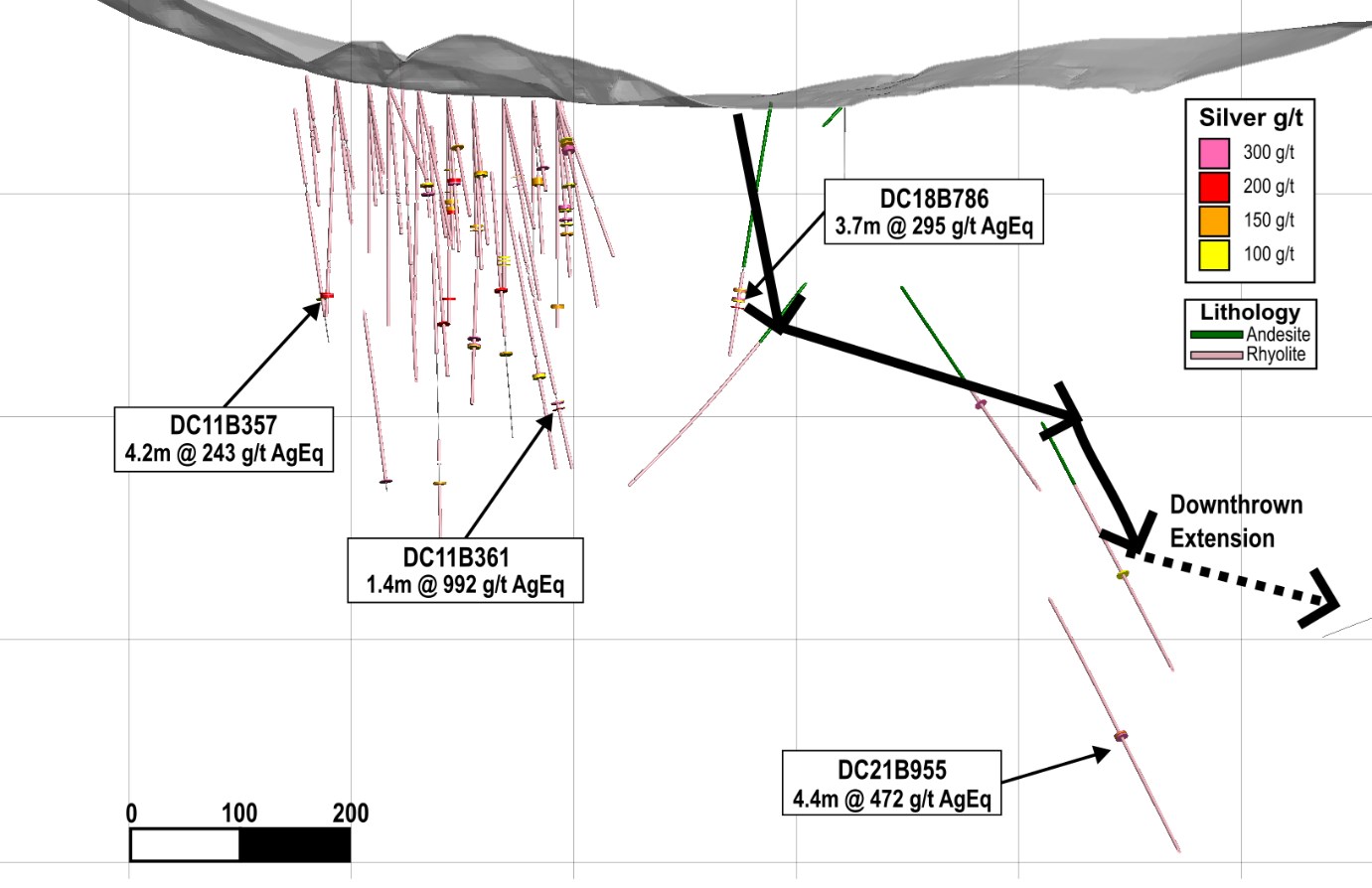 The previous project owner had discovered this structural continuation east of the Cusi fault in the Promontorio vein system, mining a portion of the first downthrown extension. Exploration drilling at Promontorio shows that the vein system continues, however only limited step out drilling has been performed. This drilling had outlined historical intercepts such as DC21M837 with 8.1 m of 286 g/t AgEq, DC17B718 with 4.2 m of 834 g/t AgEq, and DC17B757 with 3.5 m @ 361 g/t AgEq. The Company plans on following up on these results through underground drilling at Promontorio. These historical results are highlighted in Figure 5.