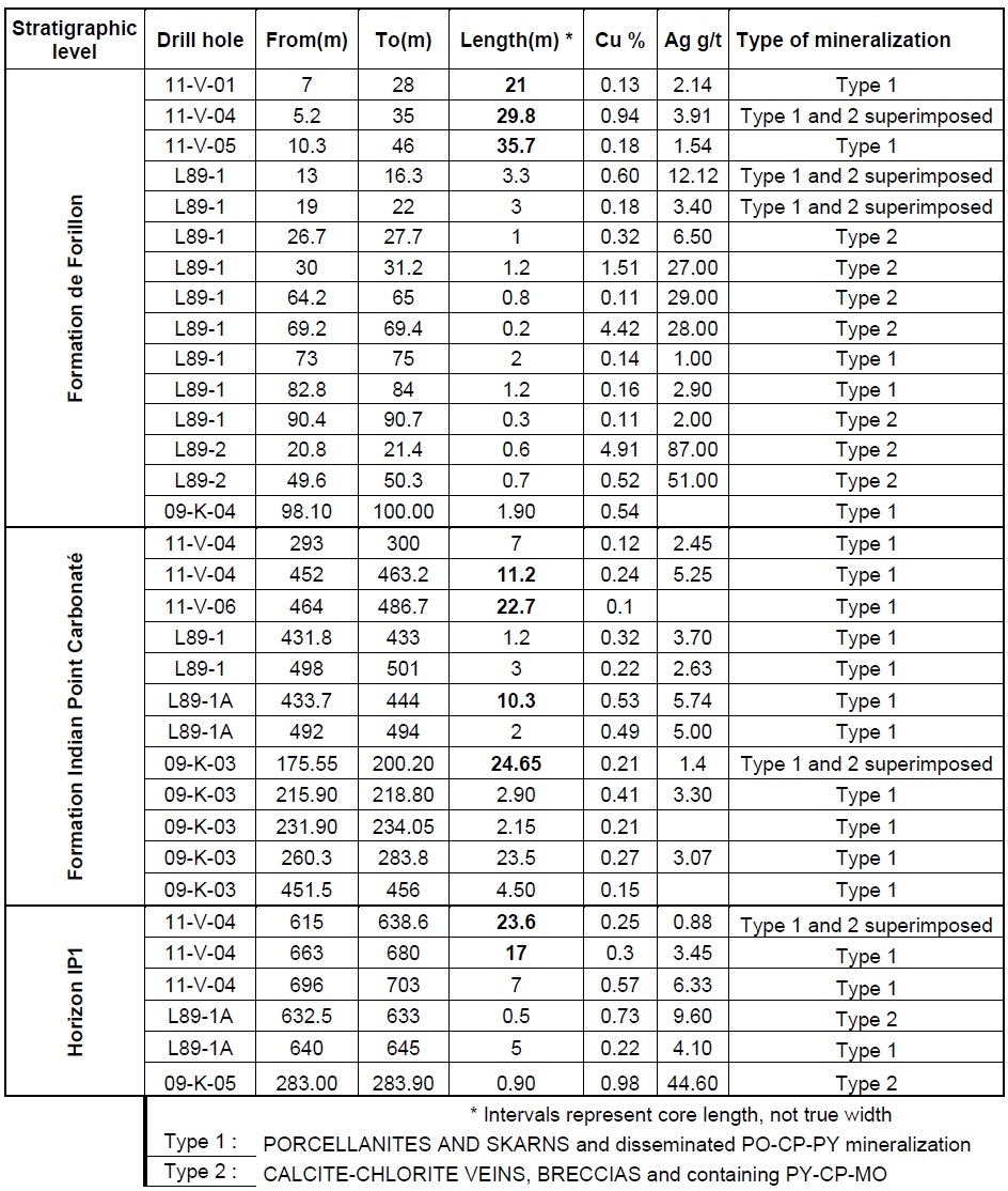 En août 2012, un communiqué de presse annonçait une découverte de 29 mètres titrant 0,94 % Cu, à partir d'une profondeur de 5,20 mètres. Le programme de forage de 3 000 mètres nous permettra de bâtir sur les résultats analytiques antérieurs, qui ont mis en évidence des intervalles significatifs, avec trois niveaux stratigraphiques présentant un fort potentiel de minéralisation.