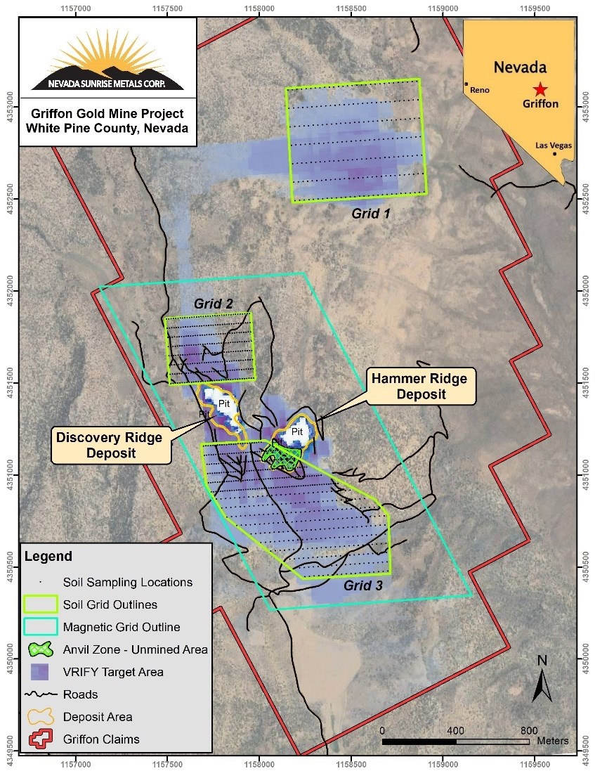 APEX Geoscience (USA) Ltd. of Reno, NV, has been engaged to carry out the first components of the Fall 2025 exploration program, which will focus on the high priority target areas defined by A.I. predictive modelling by VRIFY Technology Inc. ("VRIFY", see Nevada Sunrise news release dated September 9, 2025), including the unmined area south of the Hammer Ridge open pit (the "Anvil Zone") to help define a potential signature from a known gold occurrence (see Figure 1). Work in progress includes: