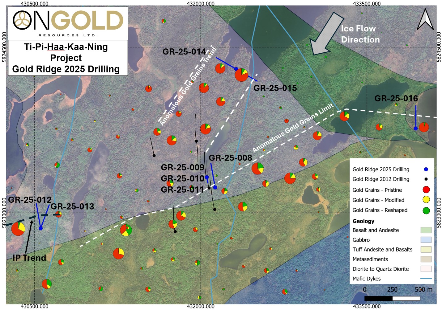 Hole GR-25-012 was drilled near an historical IP anomaly up-ice of an historical till sample containing 157 pristine gold grains and historical grab samples of angular boulders which contained anomalous gold and copper values (see ONGold's news release dated September 4, 2025). The hole intersected a zone of quartz veining, local silicification, disseminated pyrite, pyrrhotite and chalcopyrite hosted in altered diorite and gabbro which assayed 0.30g/t gold over 56.4 metres from 206.0 m to 262.4 m (including 1.06 g/t gold over 7.85 metres from 206.0 m to 213.85 m in a zone consisting of 90% quartz, including 2.24 g/t gold over 1.6 metres from 208.0 m to 209.6 m and 2.08 g/t gold over 1.15 metres from 212.7 m to 213.85 m).
