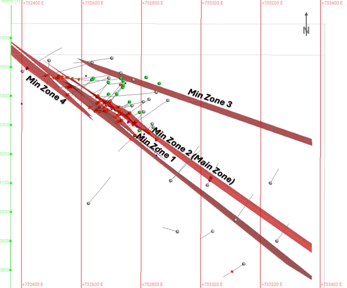 The Main Zone of the deposit consists of at least three antimony-bearing breccias and hydrothermal veins zones trending northwesterly. Mineralization has been defined over a 700-meter strike length to a vertical depth of at least 300 meters and is open in all directions and to depth. High Grade antimony has been encountered in drilling including recent intersections. The discovery Hole DDH08-03 intersected 4.51m at a grade of 11.7% Antimony (Sb) including 2.29m grading 20.9% Sb. Recent drilling has duplicated these results and extended the mineralized zone to the southeast and to depth.