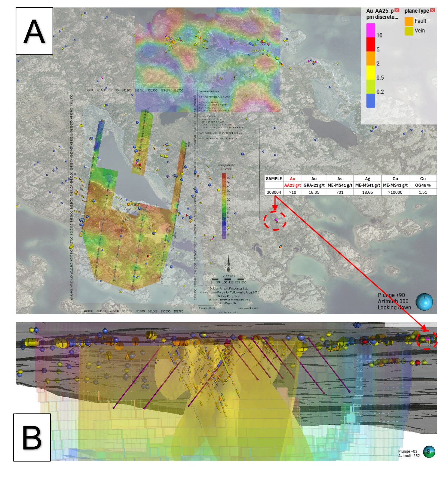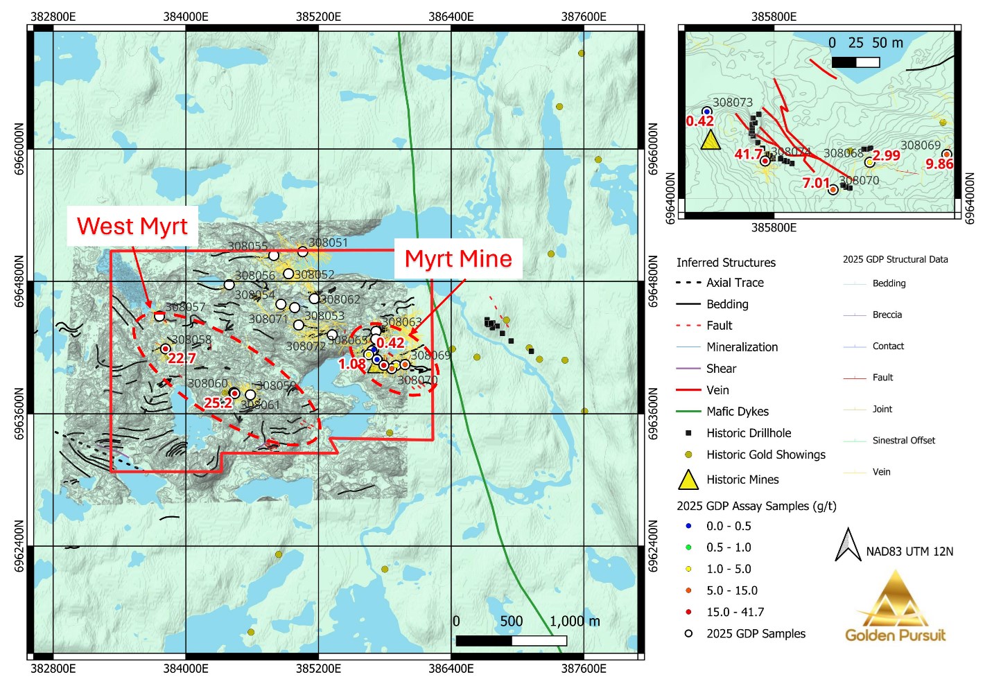 Figure 2. 2025 Sampling at Myrt Lake Property. Spatial distribution of interpreted structures, historic drillholes and showings, and new structural data and assay results. West Myrt area: Dome Number 6 (D6-2, below) showing 25.2 g/t Au, and Dome Number 10 (D-10, above) showing 22.7 g/t Au.