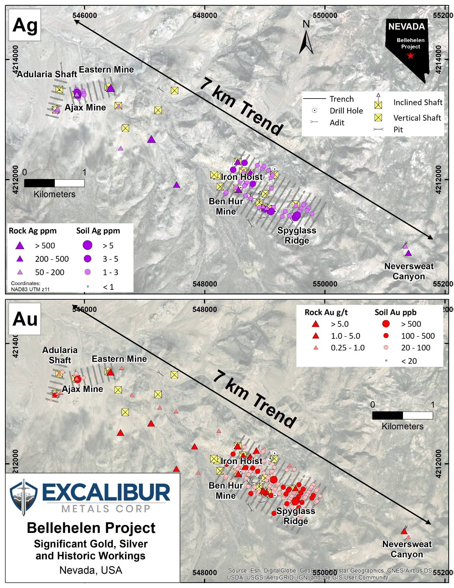 "Bellehelen represents a virtually unexplored gold and silver district in Nevada with the potential for both high-grade and bulk-tonnage discoveries," said John Gilbert, CEO of Excalibur. "The historical mines in the district along with assay results clearly show the scale of mineralization across multiple zones, highlighting the property's untapped potential. With our exploration work commencing, we're eager to unlock value from this underexplored district and deliver meaningful results for our shareholders."