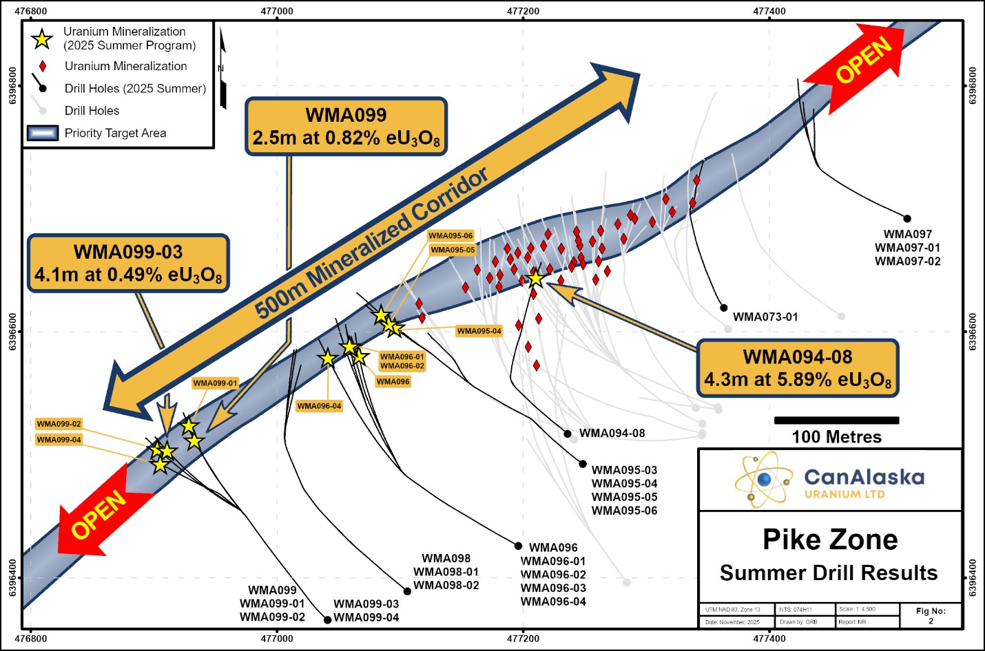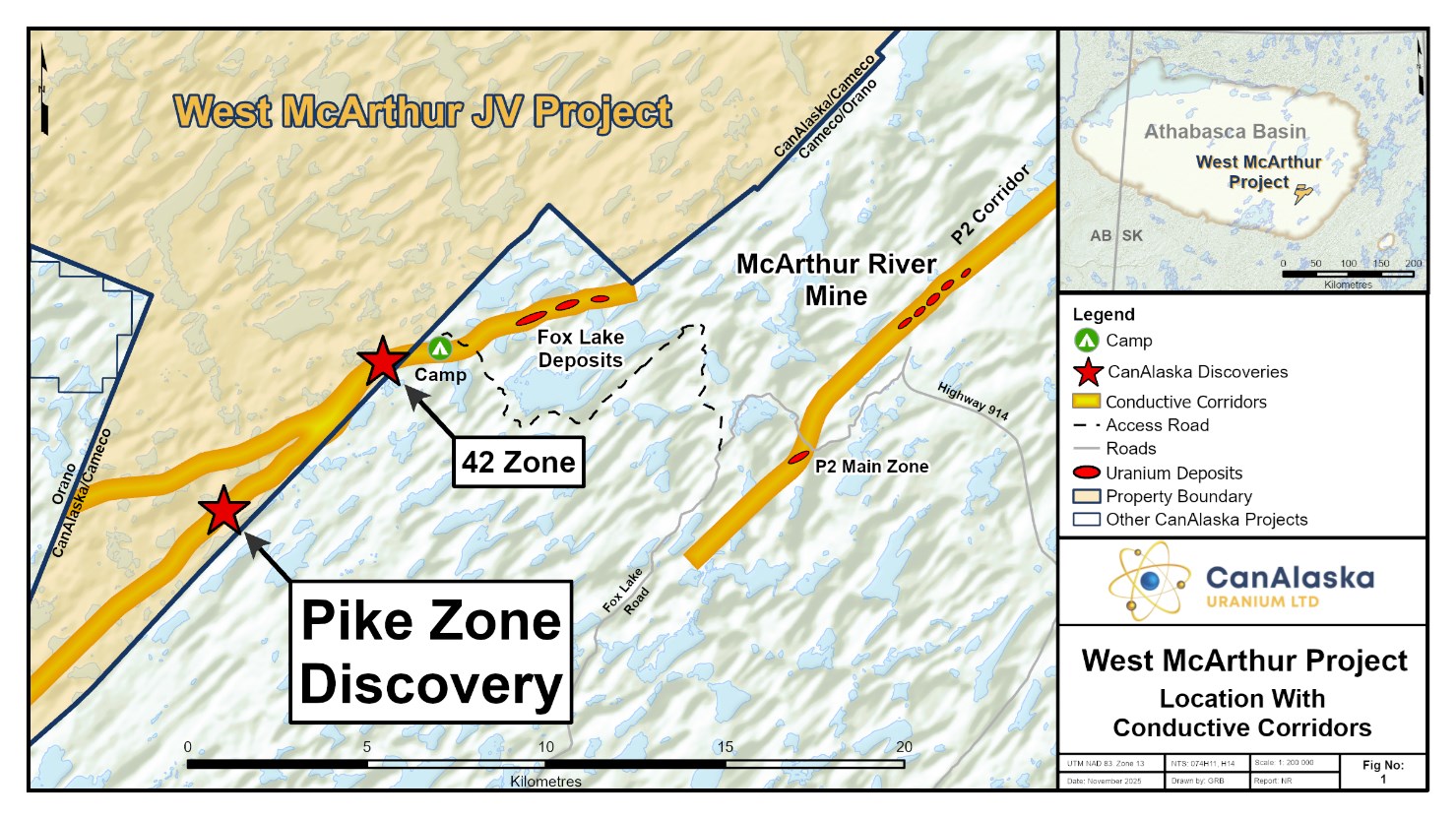 CanAlaska CEO, Cory Belyk, comments, "Following program and budget expansion in August, the 2025 drilling program at West McArthur comes to an end highlighted by some incredible results from the winter and summer drilling programs. The summer program was primarily focused on step-out drilling that delivered a greatly expanded mineralization footprint with clear indications of associated strong alteration at the western-most end of the mineralized Pike Zone corridor drilled to date. Most significantly, the intersected alteration and mineralization characteristics to the west are like those observed in direct relationship to the Pike Zone high-grade mineralization reported from the winter program. This very successful outcome will focus the start of the fully funded $15 million 2026 drilling program scheduled to begin in early January. Continued expansion of Pike Zone is timely and comes within the backdrop of renewed nuclear interest in North America as demonstrated by recent news on October 28th of the United States initiating an $80 billion reactor deal with Westinghouse."