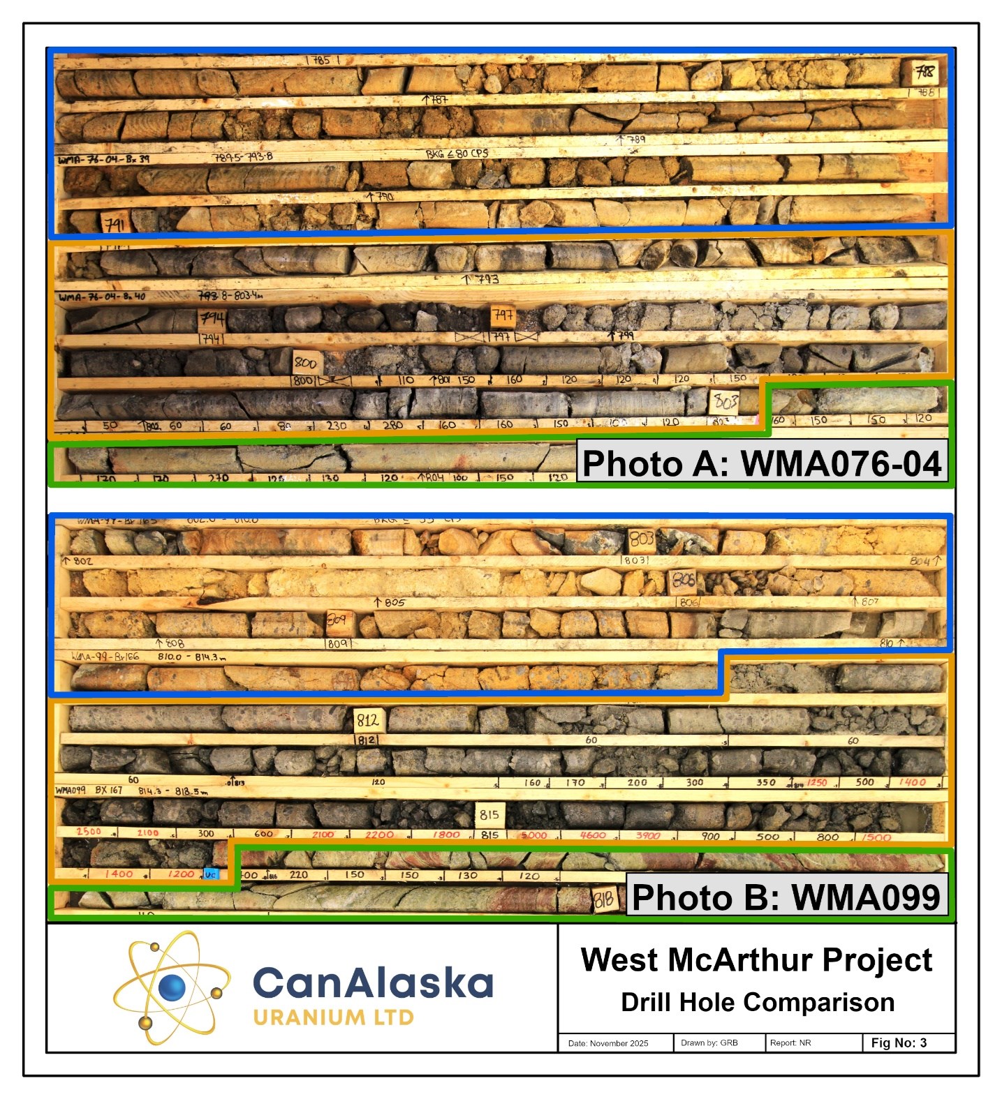 Figure 3 – Photographs comparing alteration and mineralization from WMA099 to WMA076-04. Photograph A shows WMA076-04 which intersected two intervals of 0.5 metres at 0.1% U3O8 located ~13 metres east of WMA076-01 which intersected 14.8 metres at 14.71% U3O8 including 5.4 metres at 39.67% U3O8 in the high-grade core of the Pike Zone. Photograph B shows WMA099, completed this summer, which intersected 2.5 metres at 0.82% eU3O8. The drillholes both have a strongly bleached and limonite altered lower sandstone (blue outline), followed by above a zone of unconformity-associated dark grey sooty pyrite (orange outline), and strongly altered basement (green outline). Note: For WMA076-01 and WMA076-04 details, see Press Release dated July 17th, 2025.