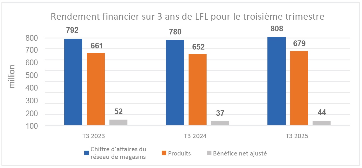 Mike Walsh, président et chef de la direction de LFL, a déclaré : « Notre équipe a connu un autre trimestre solide au troisième trimestre, et je tiens à remercier tous nos associés — qu'ils travaillent dans nos salles d'exposition, dans nos entrepôts ou dans nos équipes de livraison — pour leur dévouement constant à faire grandir notre entreprise et à offrir une expérience exceptionnelle à nos clients. Le chiffre d'affaires du réseau de magasins a augmenté de 3,7 %, la catégorie des meubles affichant particulièrement de solides résultats et des gains de parts de marché. Cette performance reflète nos décisions stratégiques visant à recentrer notre assortiment et à maintenir des stocks plus élevés d'articles clés, appuyées par l'efficacité de notre plateforme omnicanal à attirer davantage de clients prêts à acheter sur l'ensemble des canaux. La marge brute s'est accrue de 79 points de base, reflétant à la fois la composition favorable des ventes de meubles et les améliorations continues au sein de l'entreprise, notamment des partenariats plus serrés avec des fournisseurs, l'optimisation de l'approvisionnement et une stratégie promotionnelle améliorée. La solidité de ces résultats, conjuguée à une discipline opérationnelle soutenue et à des comparaisons de coûts favorables, s'est traduite par une hausse du bénéfice dilué par action ajusté de 20,4 %. »