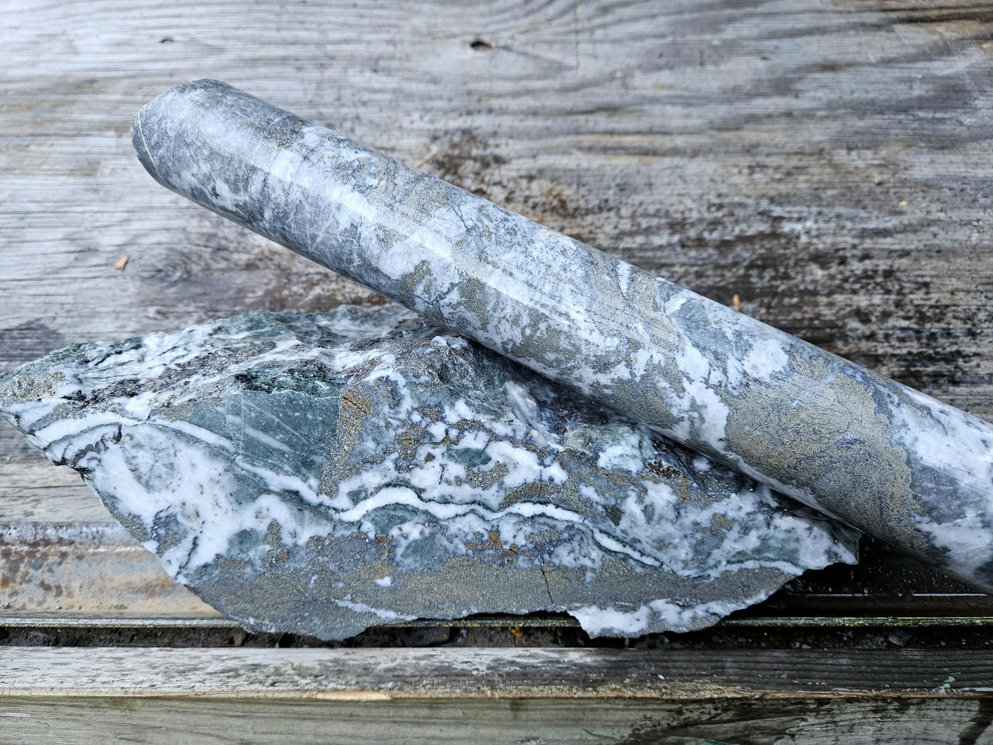 Figure 1. Homestake Silver NQ drill core from hole HR25-469 of a sample interval grading 91 g/t Au over 0.63 meters compared to a slab with similar gold grade from the 320 level at Ascot Resources Ltd.'s Premier Mine near Stewart, BC. Mineralization hosted in multi phase vein and vein breccias with strong pyrite, chalcopyrite, galena, sphalerite and visible gold